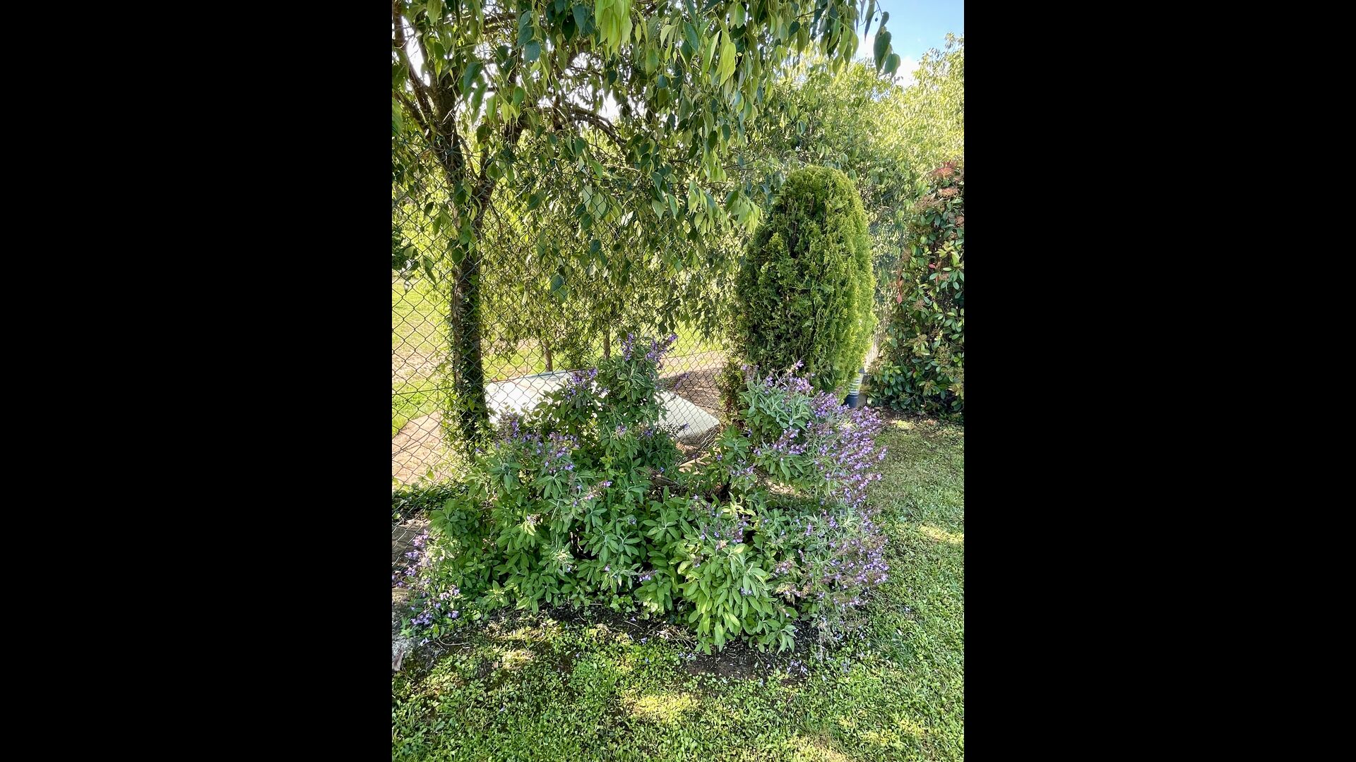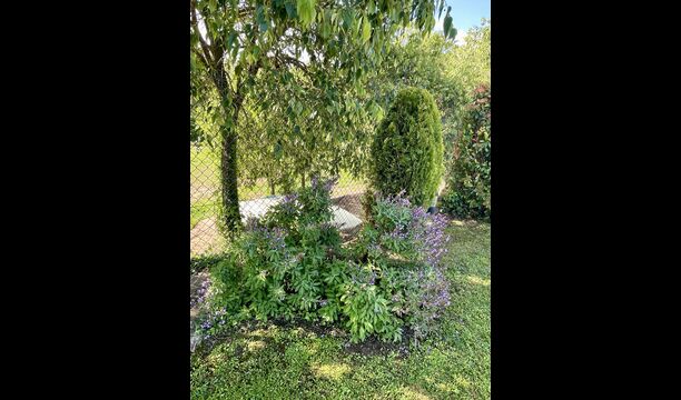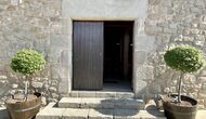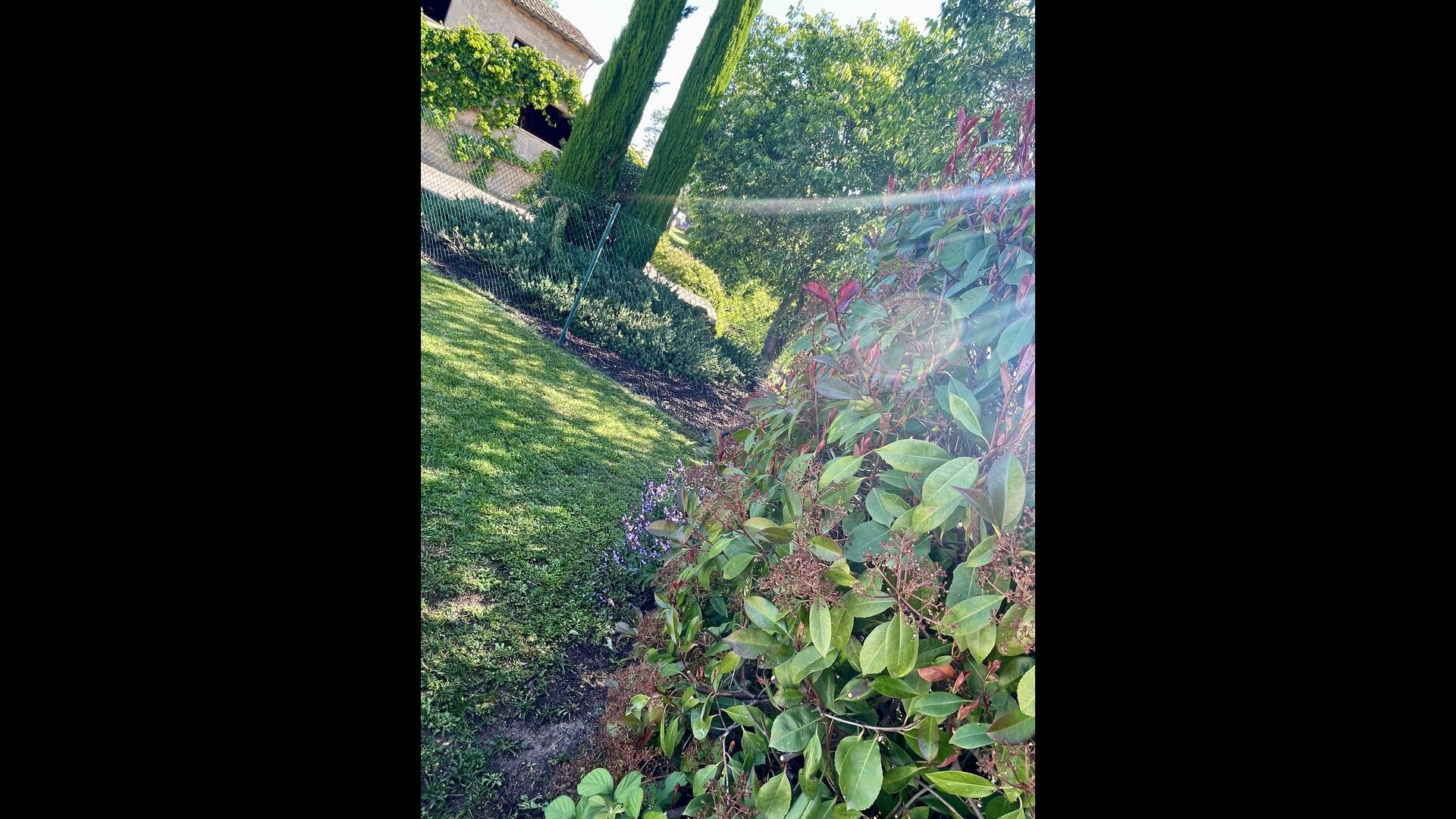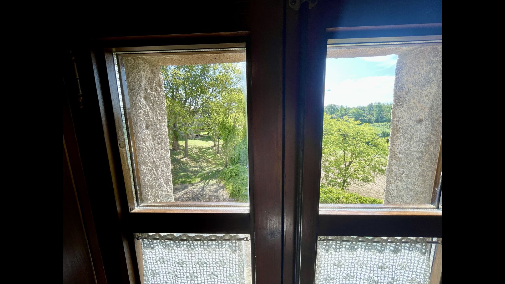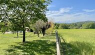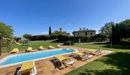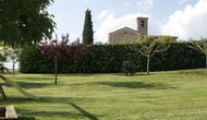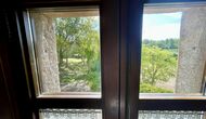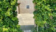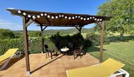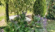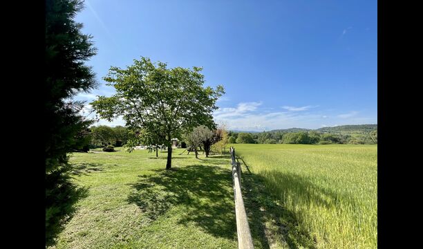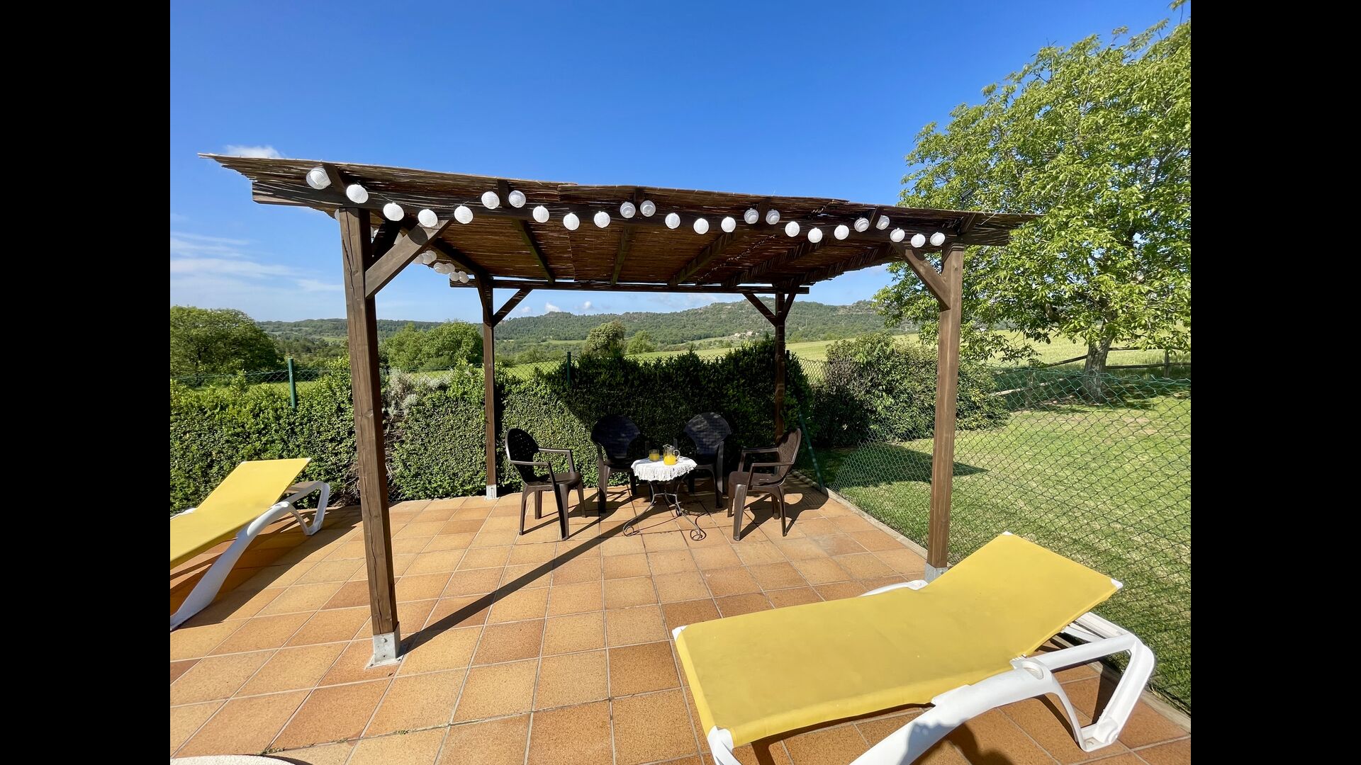Den imponerende port, der i gamle dage var stor nok til, at hestevognene kunne komme ind, giver adgang til det smukke have- og poolområde. I den ene ende, græsplænen med nogle træer, der giver skygge. Desuden er der en sandkasse og gynger til de yngste, og nogle borde til lette måltider. I den anden ende, swimmingpoolen med romerske trin, det er faktisk meget rart, når man har små børn i sin gruppe. Med en kold drink og en bog og med den smukke udsigt over det bakkede landskab med marker og skov, får roen og lydene de sidste rester af den stressede hverdag til at forsvinde.