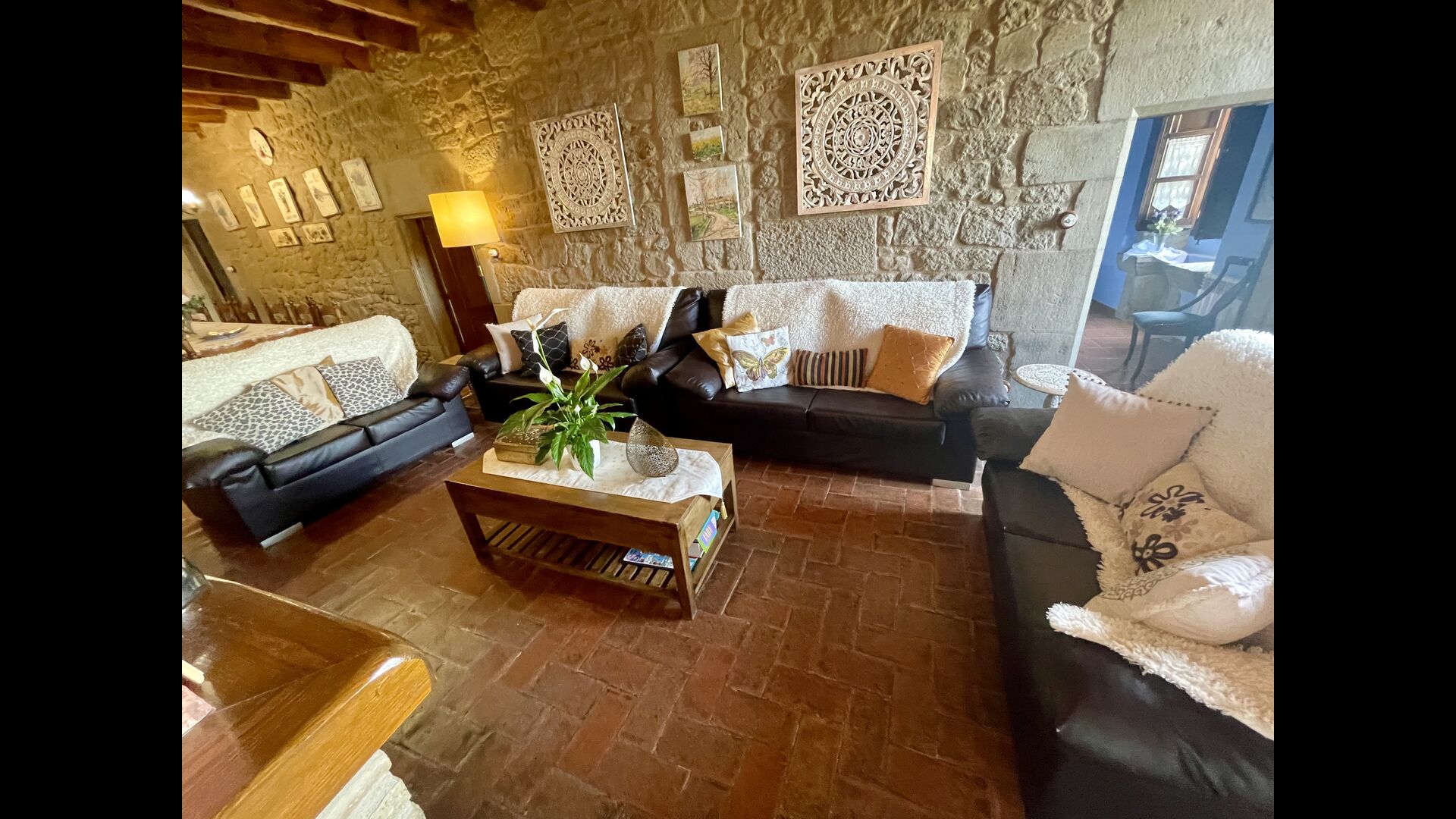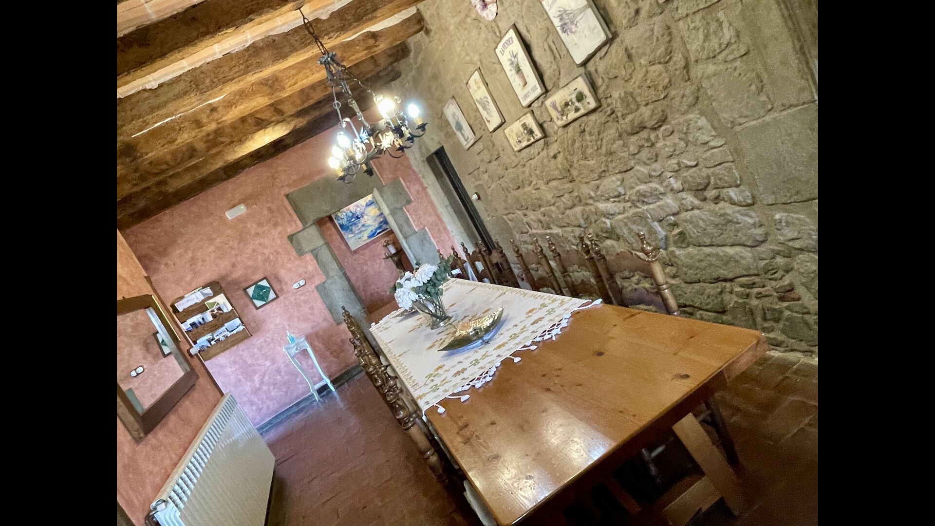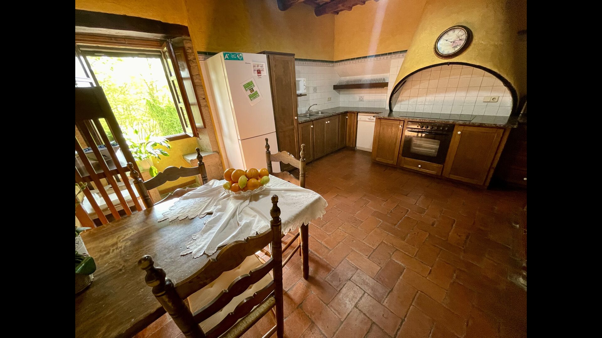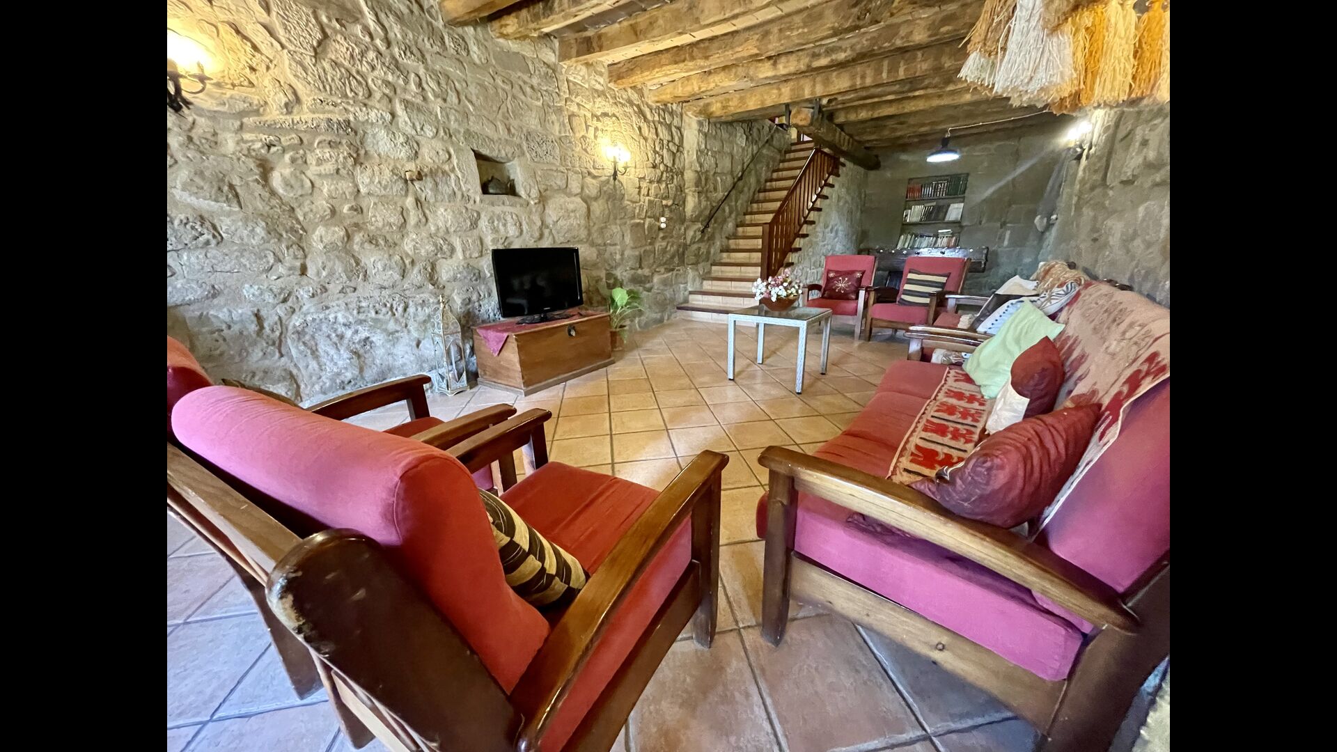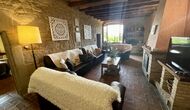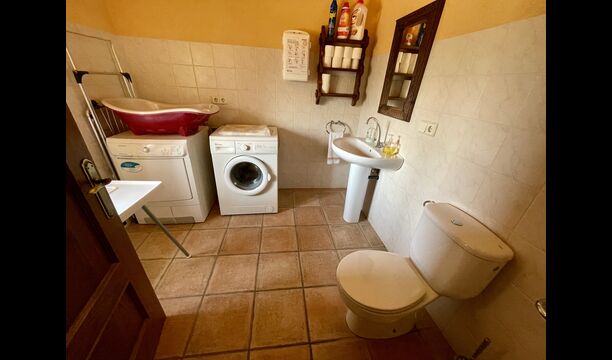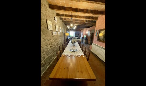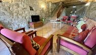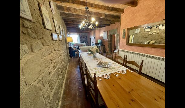 I dag er huset blevet fuldstændigt restaureret med bevarelse af sin oprindelige struktur. Bygget på en glidende sten, vil indgangen fra parkeringspladsen faktisk bringe dig direkte ind på første sal. Her er der et køkken med alle redskaber (komfur, mikroovn, opvaskemaskine, køkkenredskaber osv.), en meget stor stue/spisestue med et enormt spisebord i træ og fungerer også som fordelingsrum for alle. soveværelserne. Huset har i alt 6 soveværelser, hvoraf 2 er med tre senge. Hvert af soveværelserne har deres eget badeværelse. Derudover er der et toilet nedenunder, nyttigt når man opholder sig udenfor. Huset har også tv, dvd og WIFI-internet.