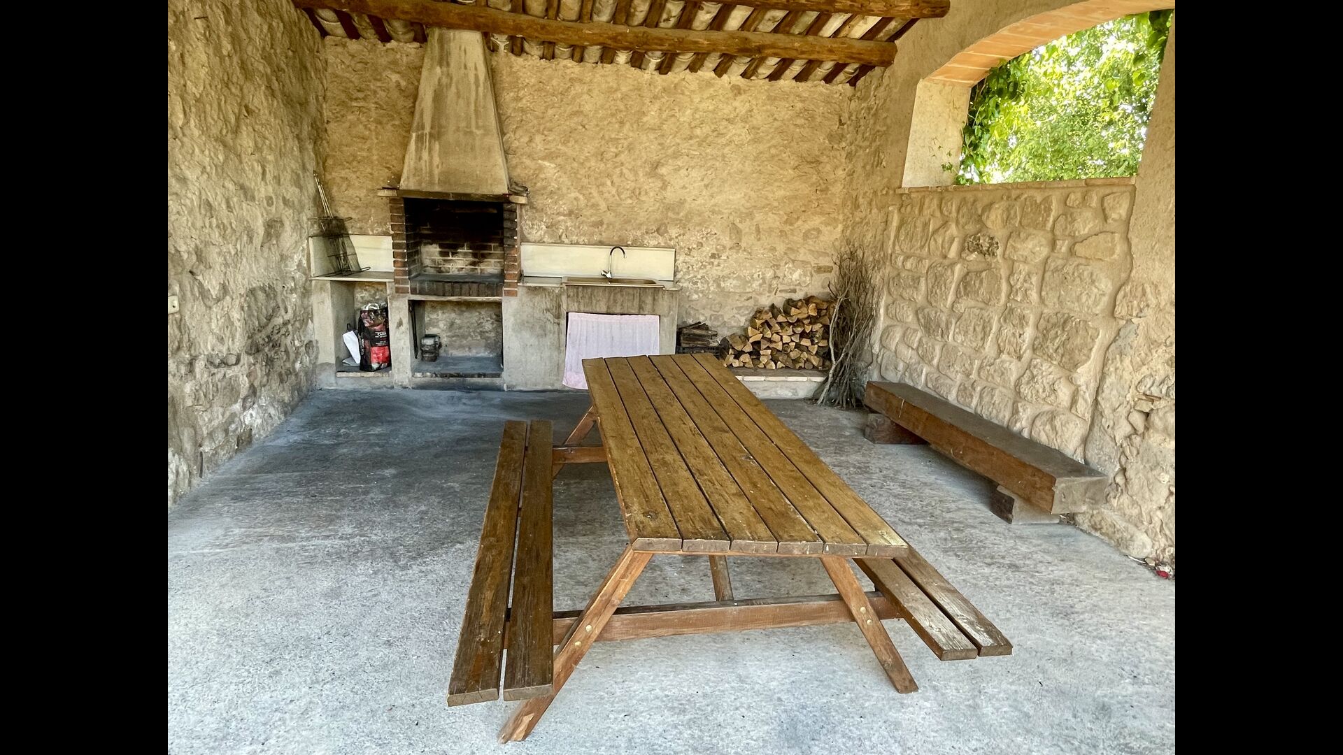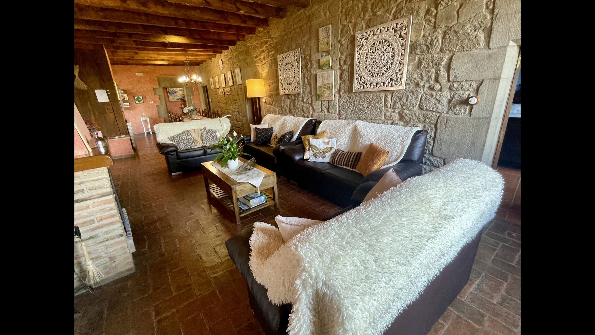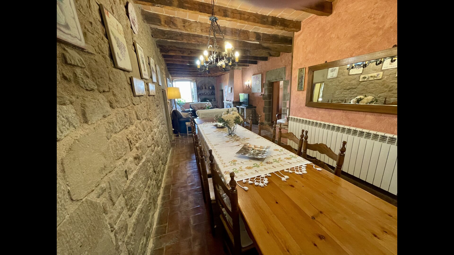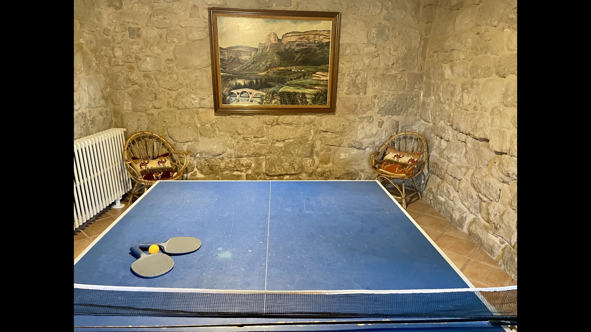 I dag er huset blevet fuldstændigt restaureret med bevarelse af sin oprindelige struktur. Bygget på en glidende sten, vil indgangen fra parkeringspladsen faktisk bringe dig direkte ind på første sal. Her er der et køkken med alle redskaber (komfur, mikroovn, opvaskemaskine, køkkenredskaber osv.), en meget stor stue/spisestue med et enormt spisebord i træ og fungerer også som fordelingsrum for alle. soveværelserne. Huset har i alt 6 soveværelser, hvoraf 2 er med tre senge. Hvert af soveværelserne har deres eget badeværelse. Derudover er der et toilet nedenunder, nyttigt når man opholder sig udenfor. Huset har også tv, dvd og WIFI-internet.