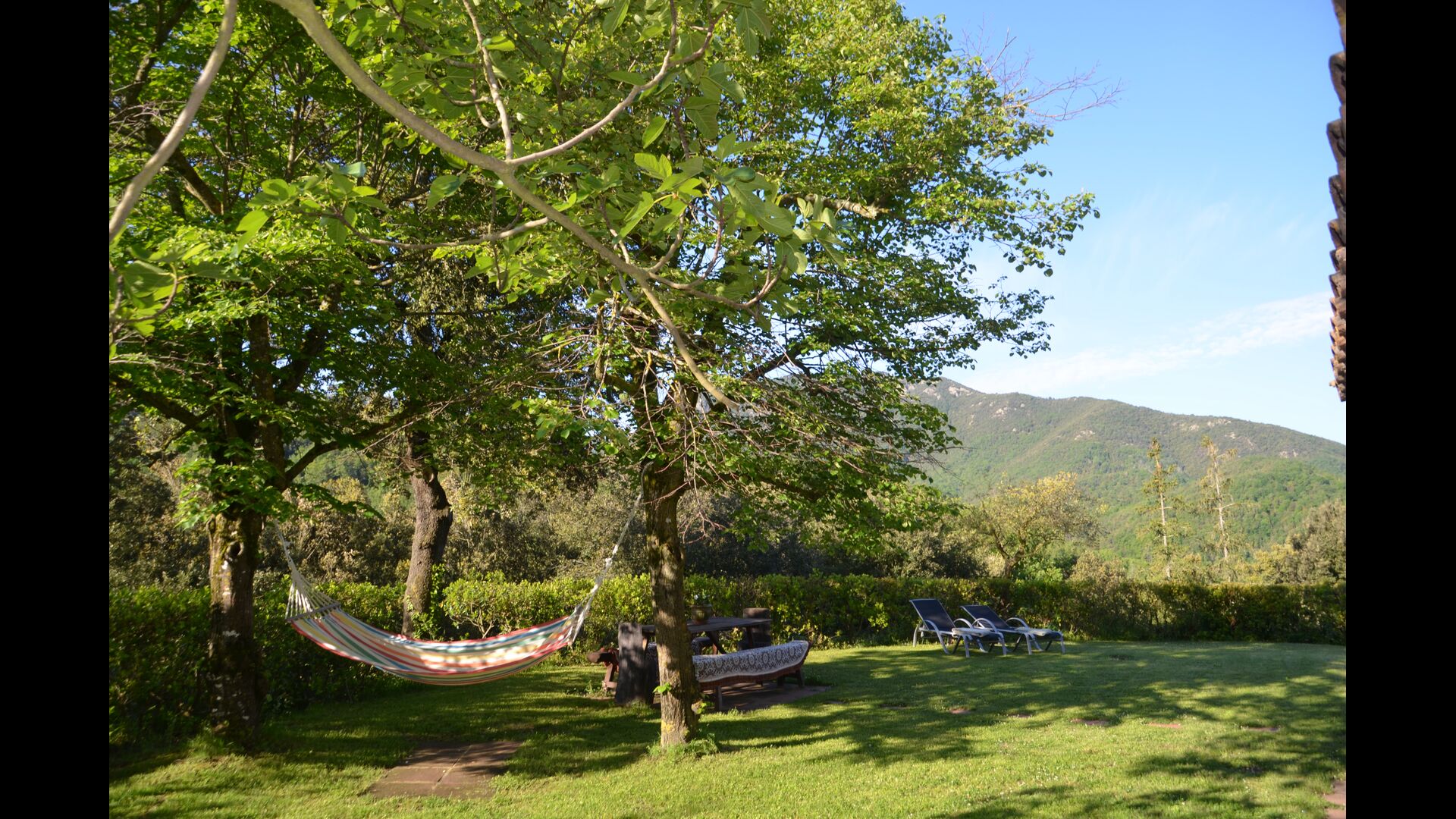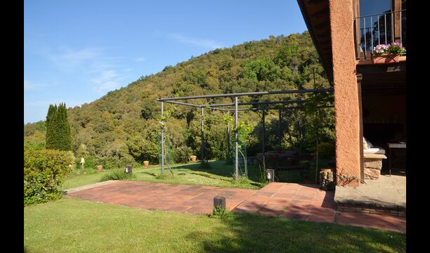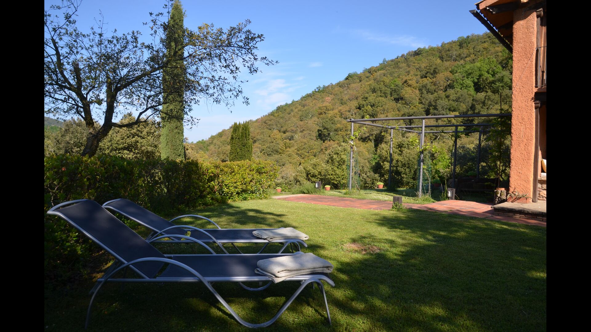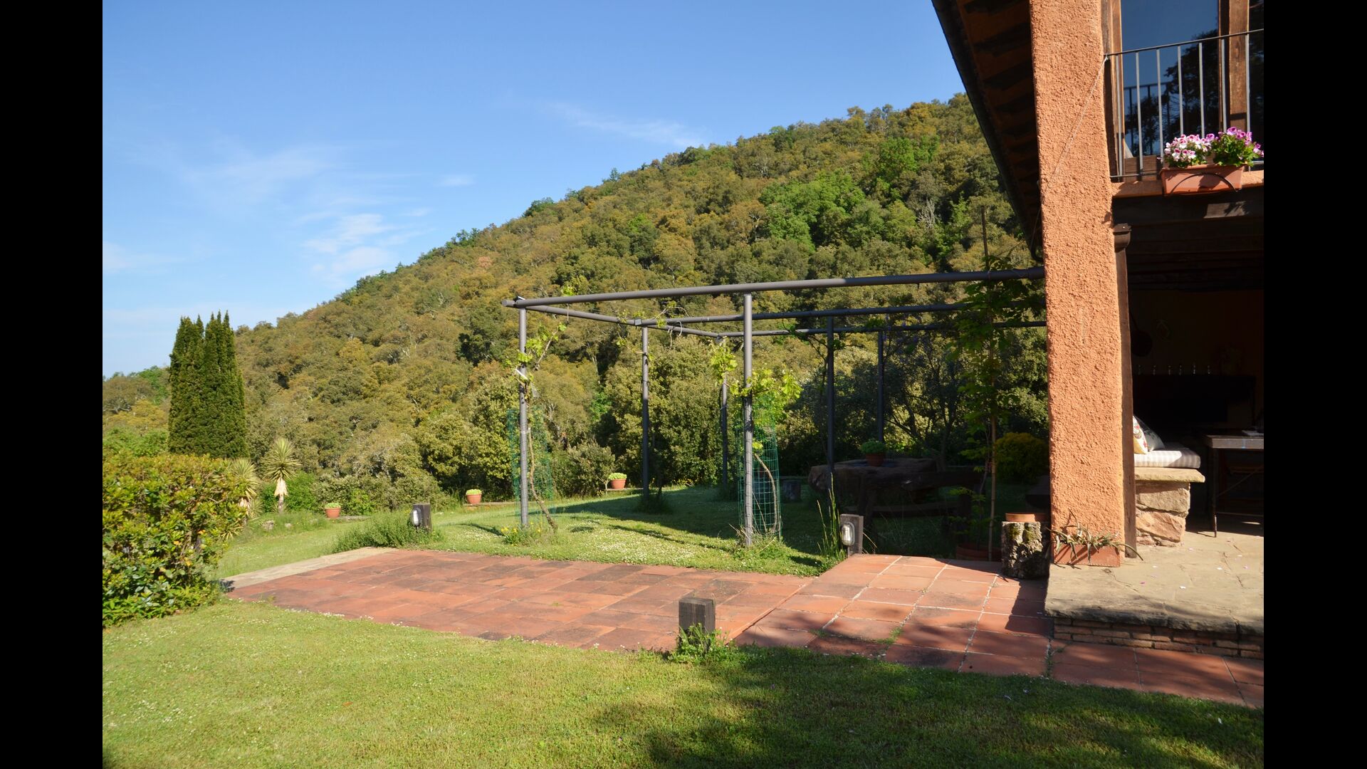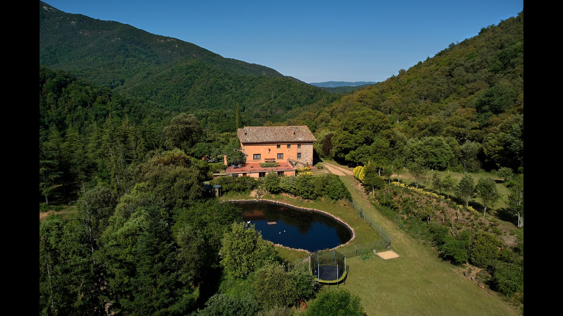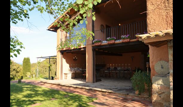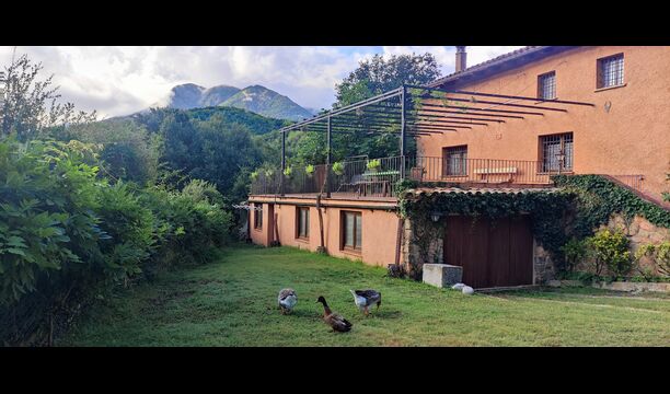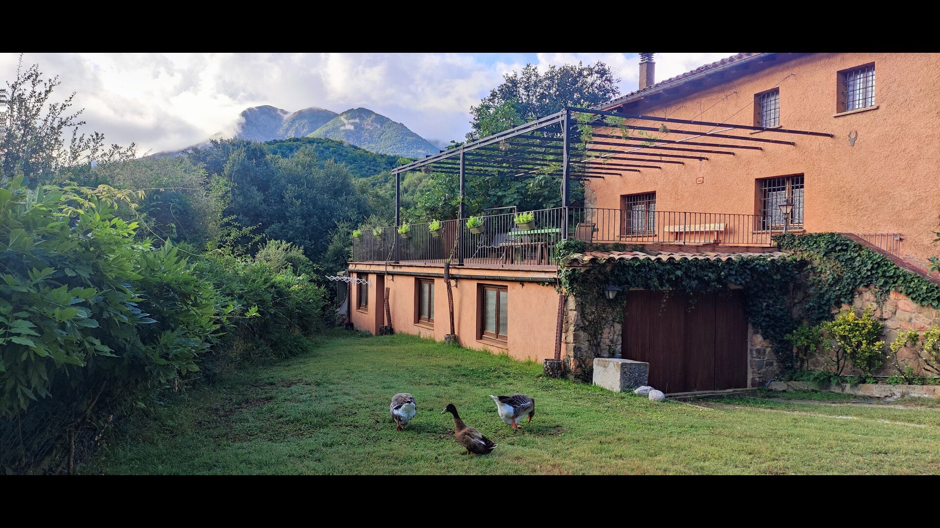 Til venstre for huset, er der en stor græsplæne og en indhegnet dam med ænder og andre fugle. På den anden side af huset, finder du indgangen til huset. Til højre for indgangen, er der en overdækket udendørs terrasse til udendørs spisning. Der er også en anden terrasse i solen samt en græsplæne med mange træer, der giver skygge på de varme catalanske sommerdage. Der er desuden et bordtennisbord til de aktive.