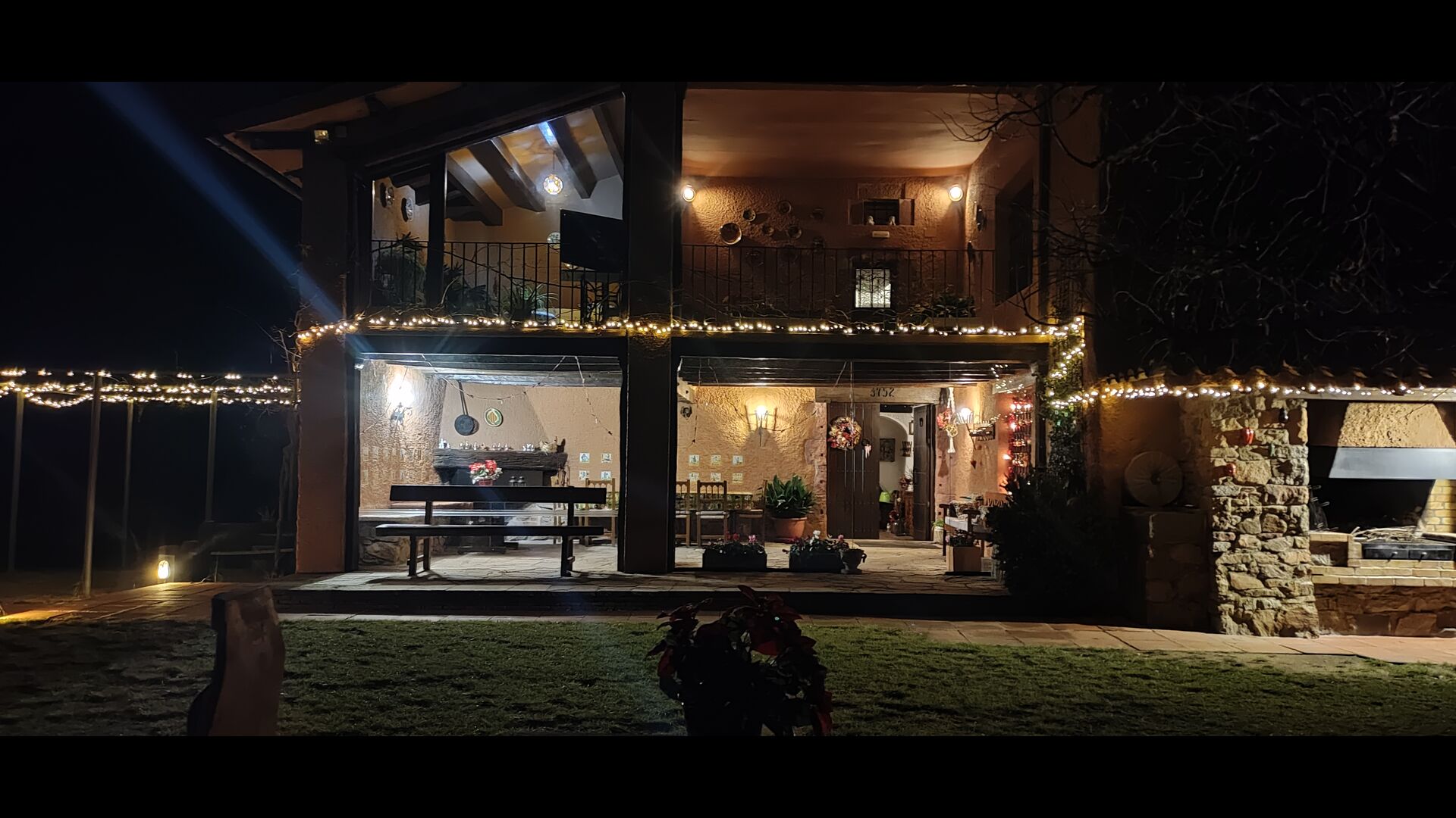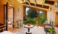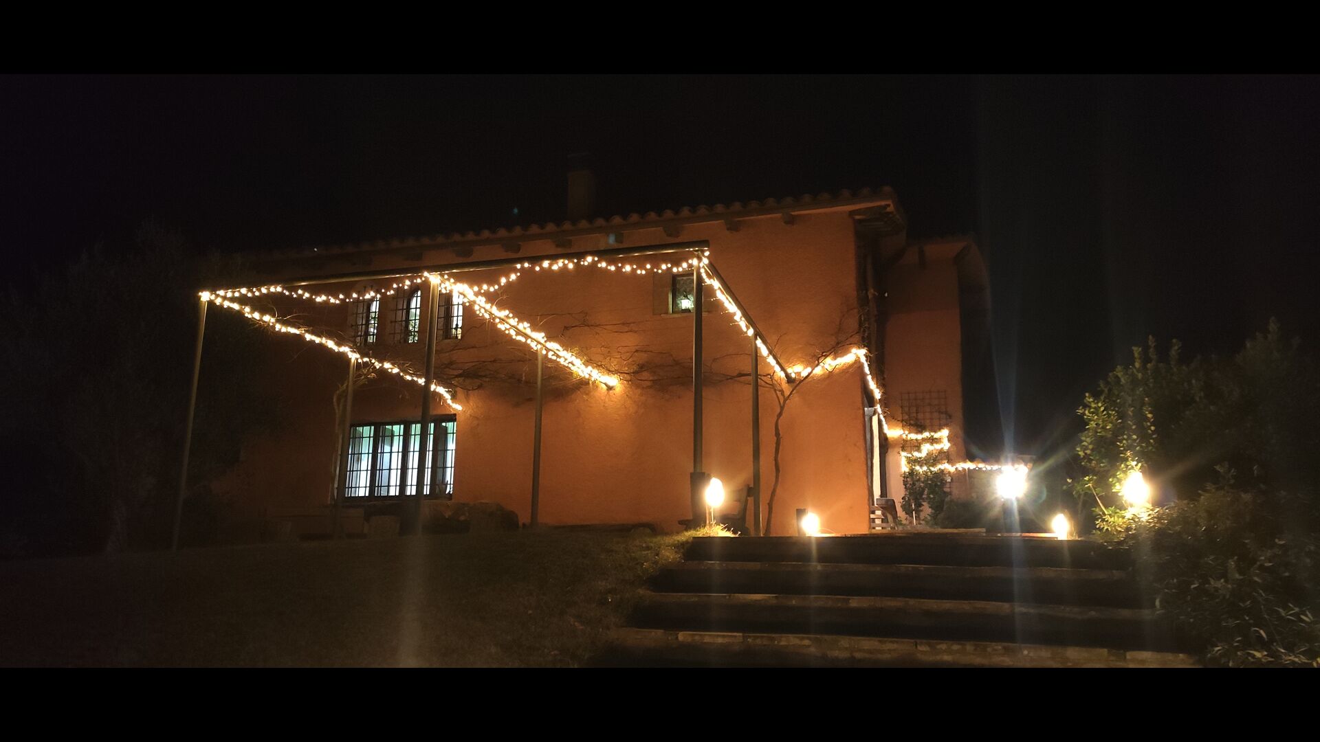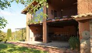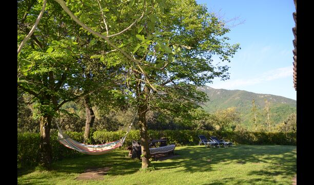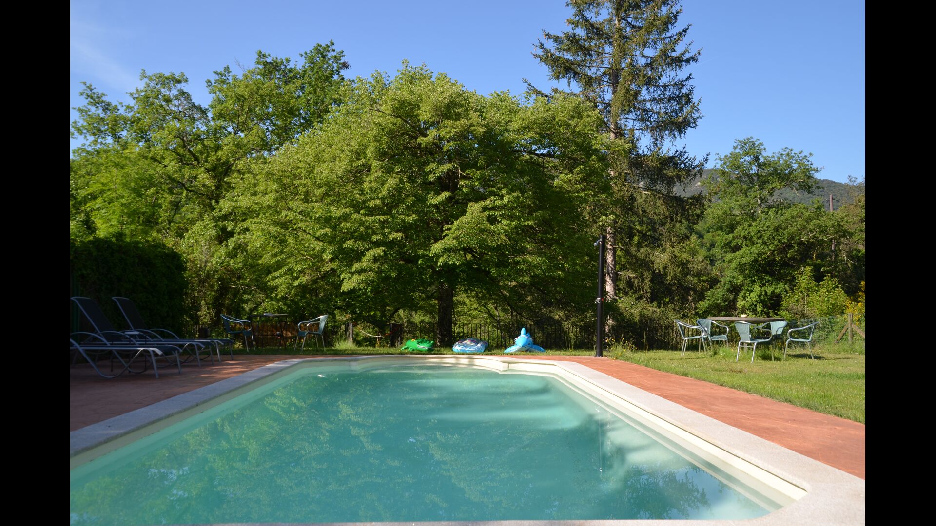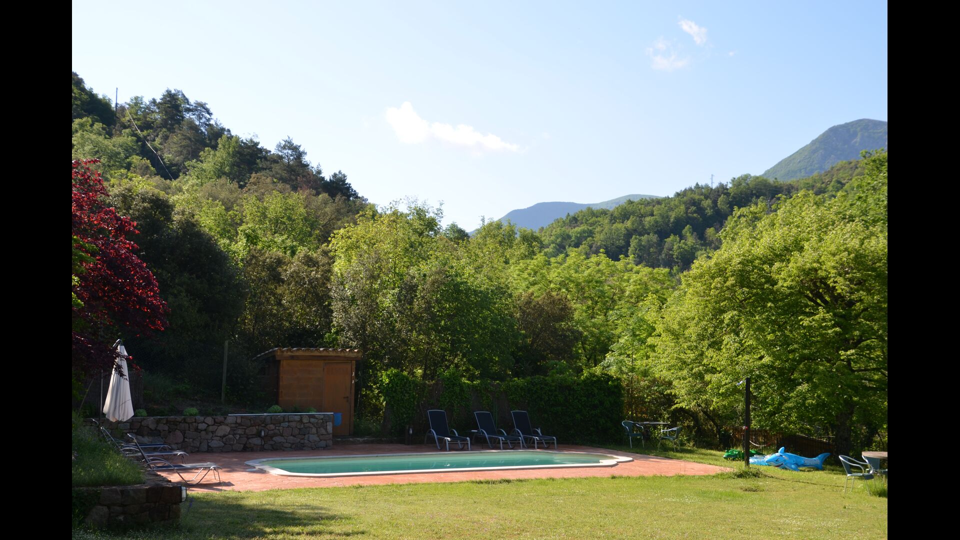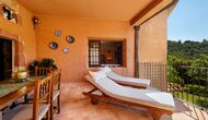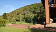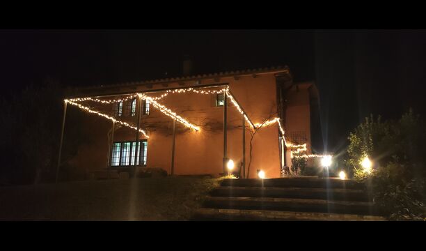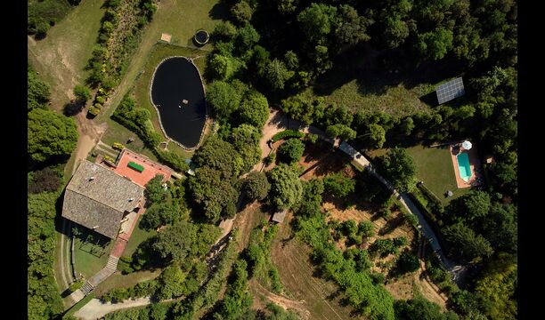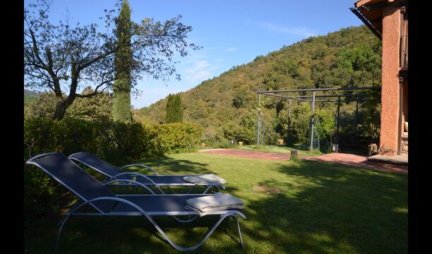Til venstre for huset, er der en stor græsplæne og en indhegnet dam med ænder og andre fugle. På den anden side af huset, finder du indgangen til huset. Til højre for indgangen, er der en overdækket udendørs terrasse til udendørs spisning. Der er også en anden terrasse i solen samt en græsplæne med mange træer, der giver skygge på de varme catalanske sommerdage. Der er desuden et bordtennisbord til de aktive.