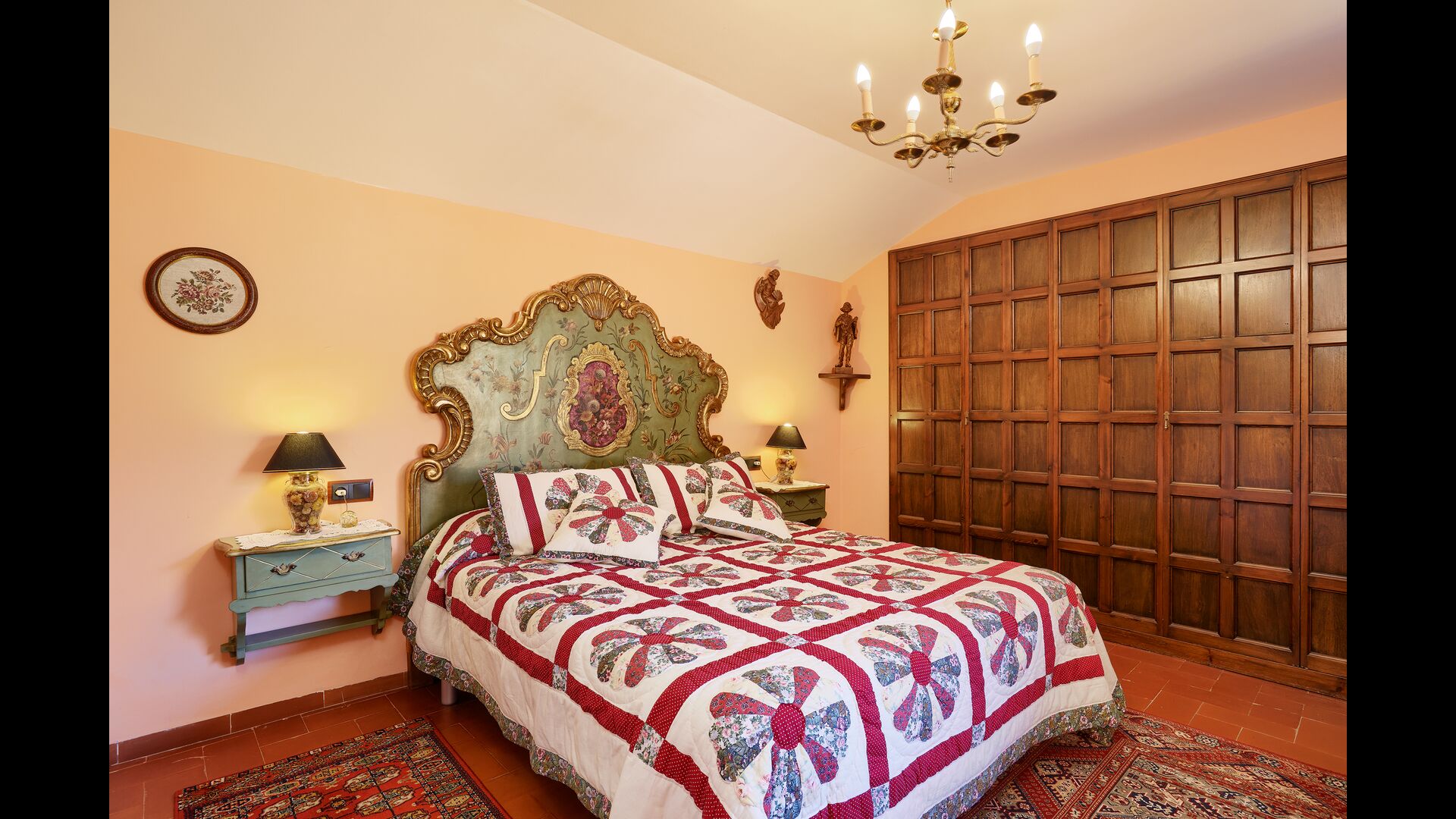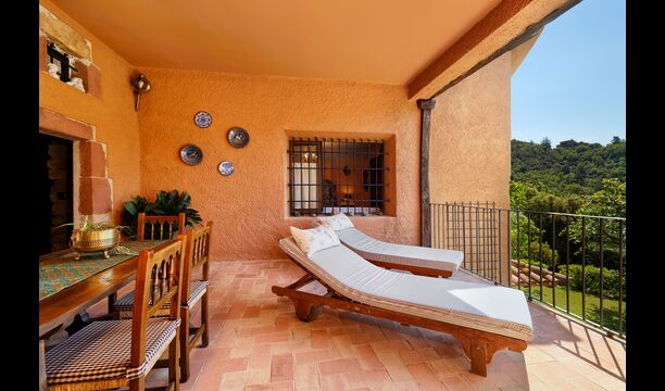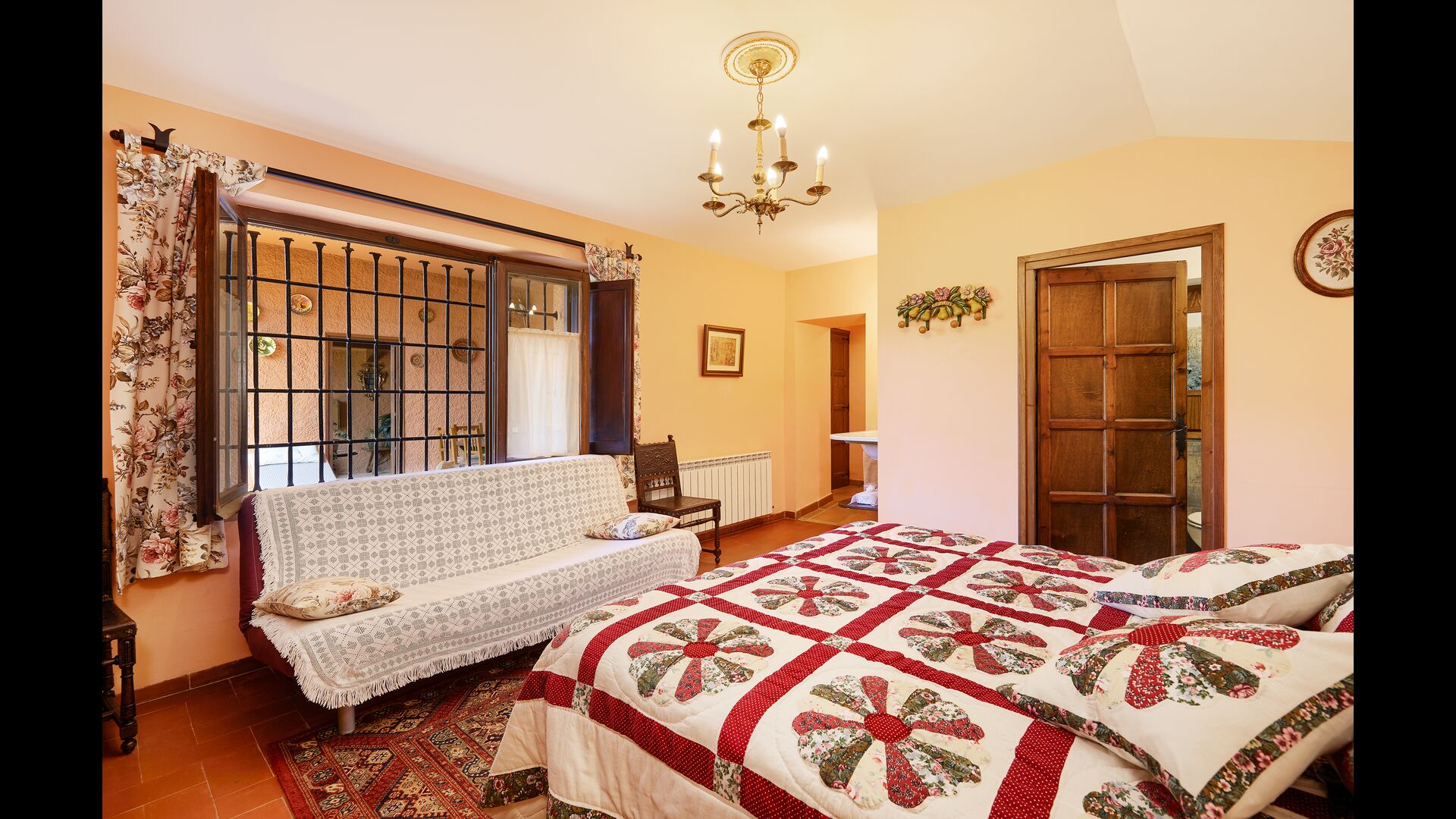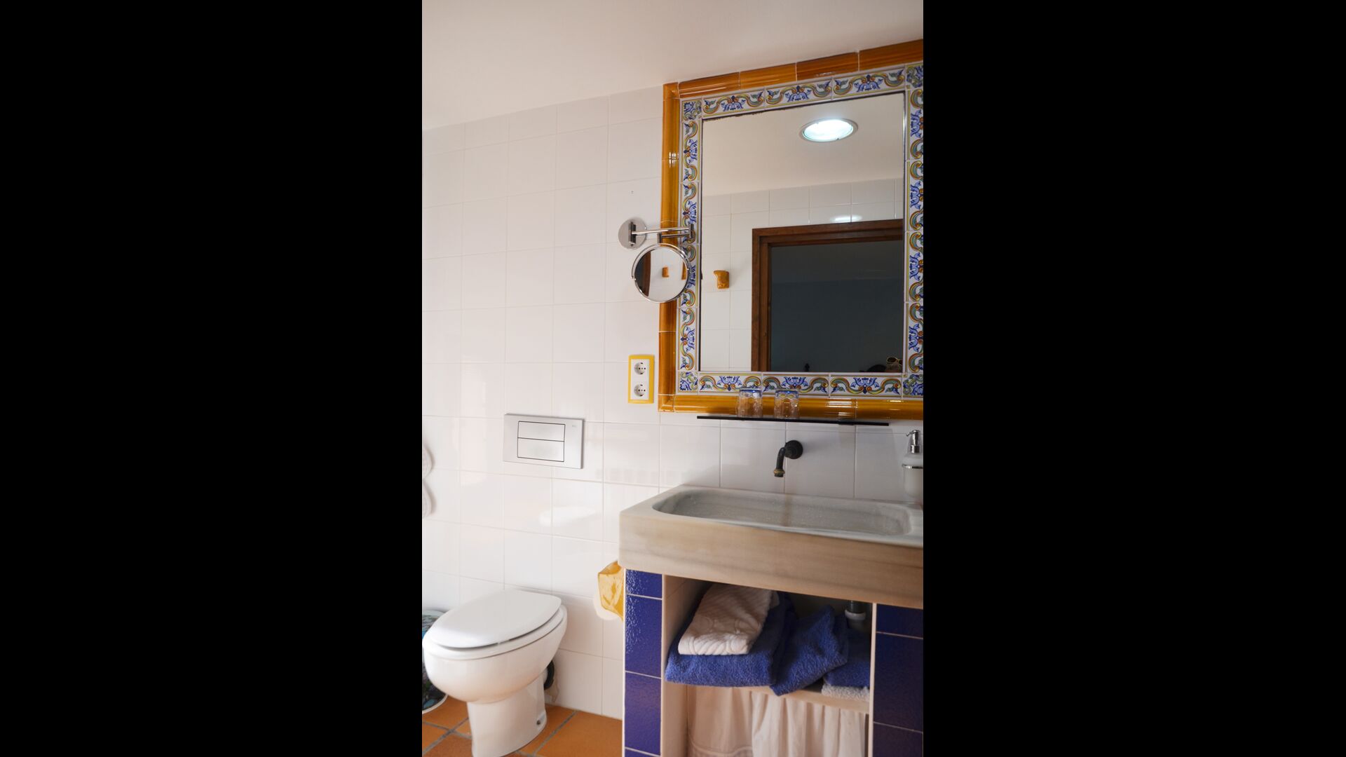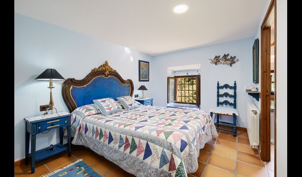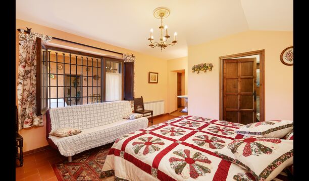 På første sal finder du de 5 soveværelser. Tre af dem har dobbeltsenge, et af dem har to enkeltsenge, som også kan arrangeres som dobbeltseng. Endelig er der et værelse med tre senge. Der er fire fuldt udstyrede badeværelser til deling. Også ovenpå, har du adgang til en terrasse med en smuk udsigt. Det er muligt at lukke den med glasskydedøre, hvis du bor i huset i efteråret eller om vinteren.