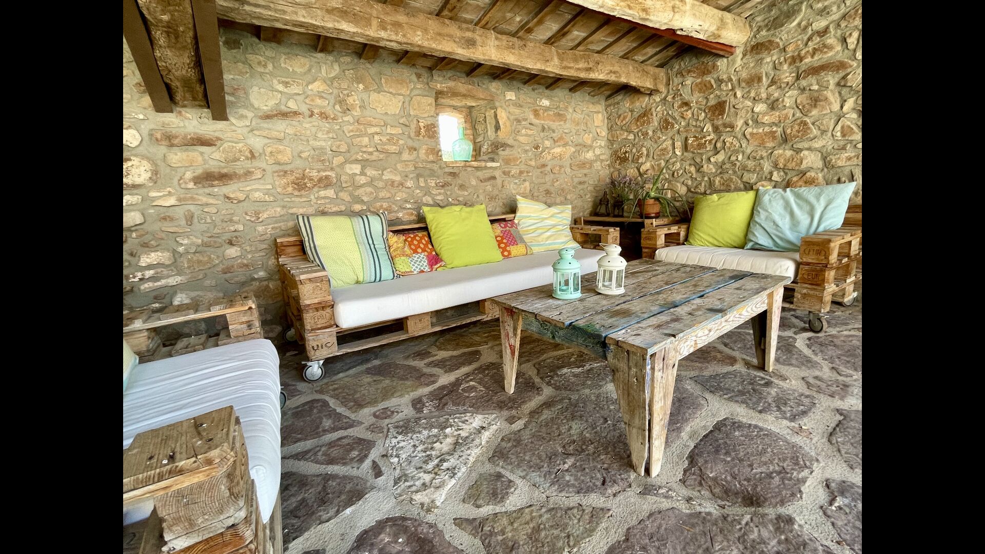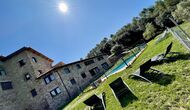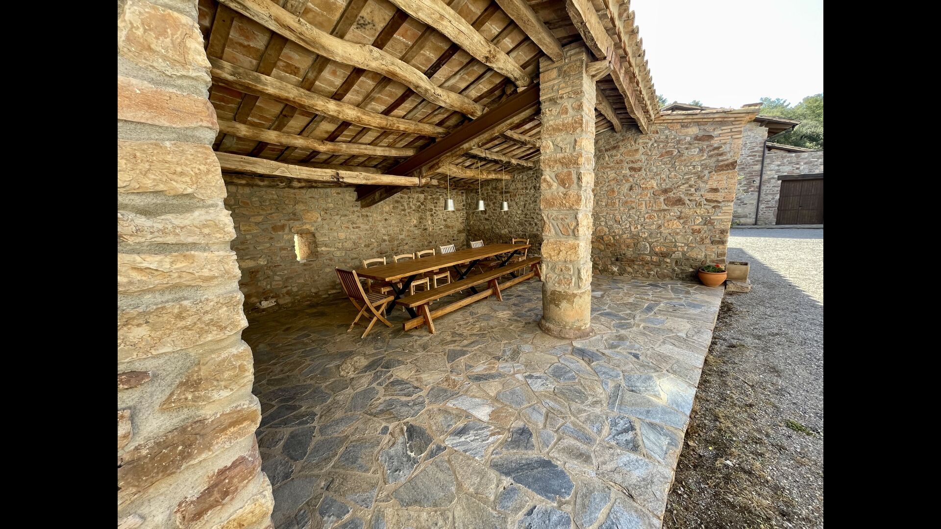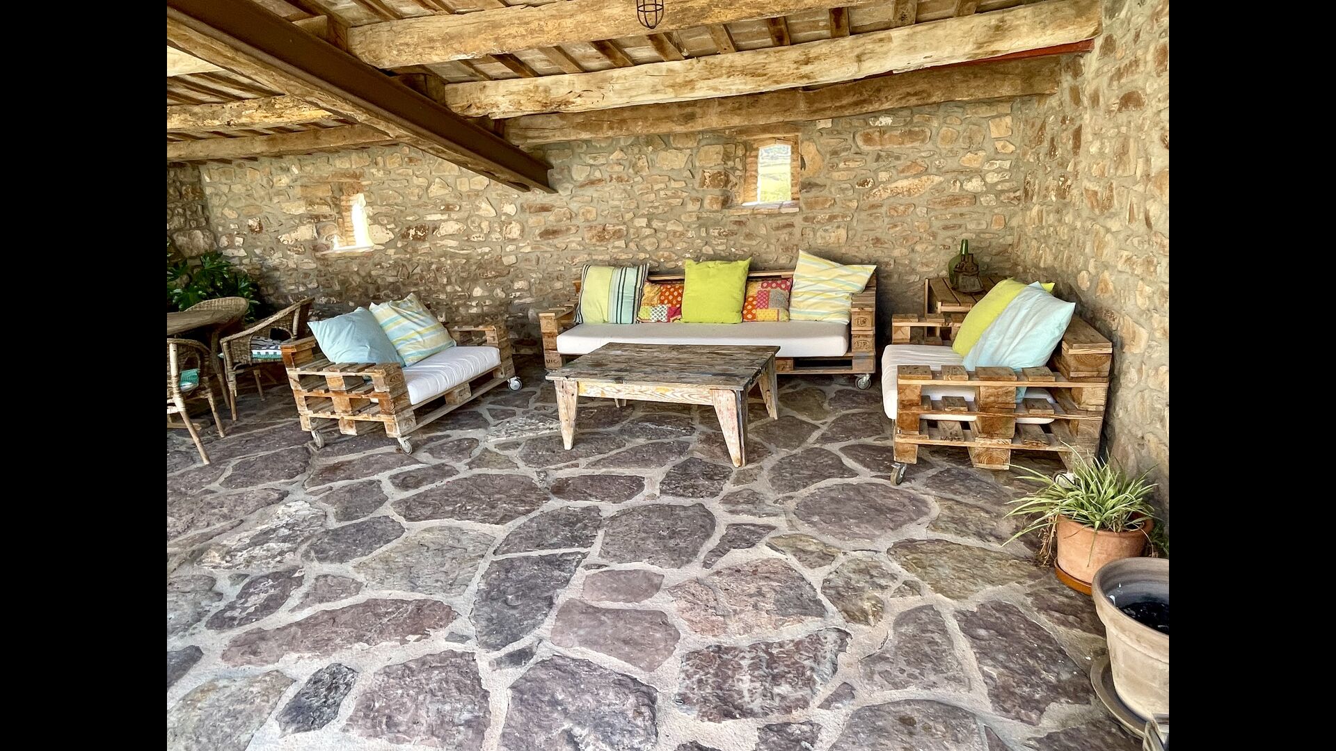 Husene ligger i smukke omgivelser og i forskellige planer. Der er områder til afslapning og barbecue og den overdækkede terrasse, beliggende tværs over den indre gård fra køkkenet, er særdeles velegnet til måltider i det fri og det oplagte sted at tilbringe de varme sommeraftener.