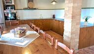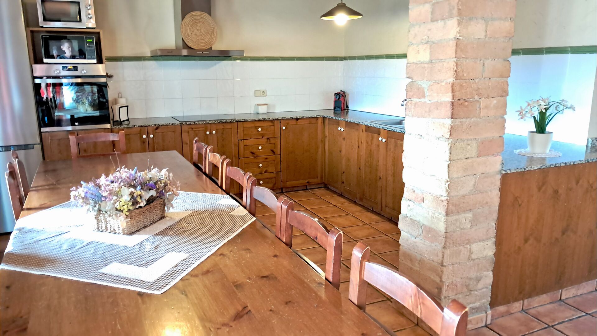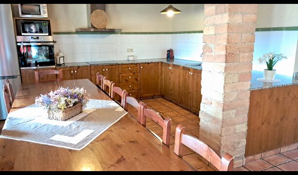 Køkkenet er stort, åbent og veludstyret og er forbundet med det lange, flotte spisebord i træ. Herfra er der udsigt over den flotte dal. Køkkenet har blandt andet køleskab og fryser, ovn, mikroovn, kaffemaskine samt vaskemaskine.