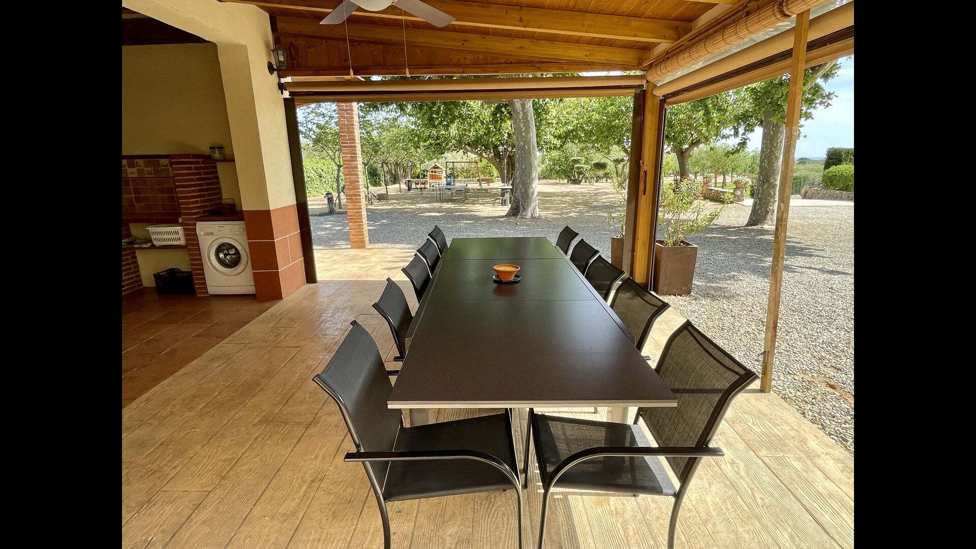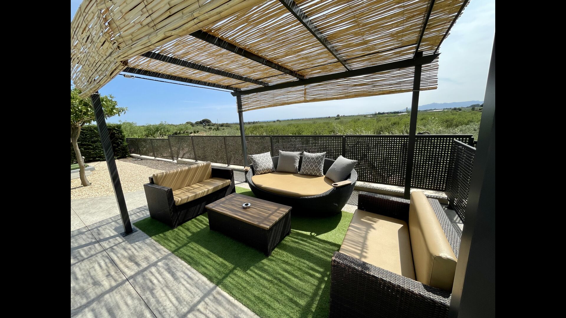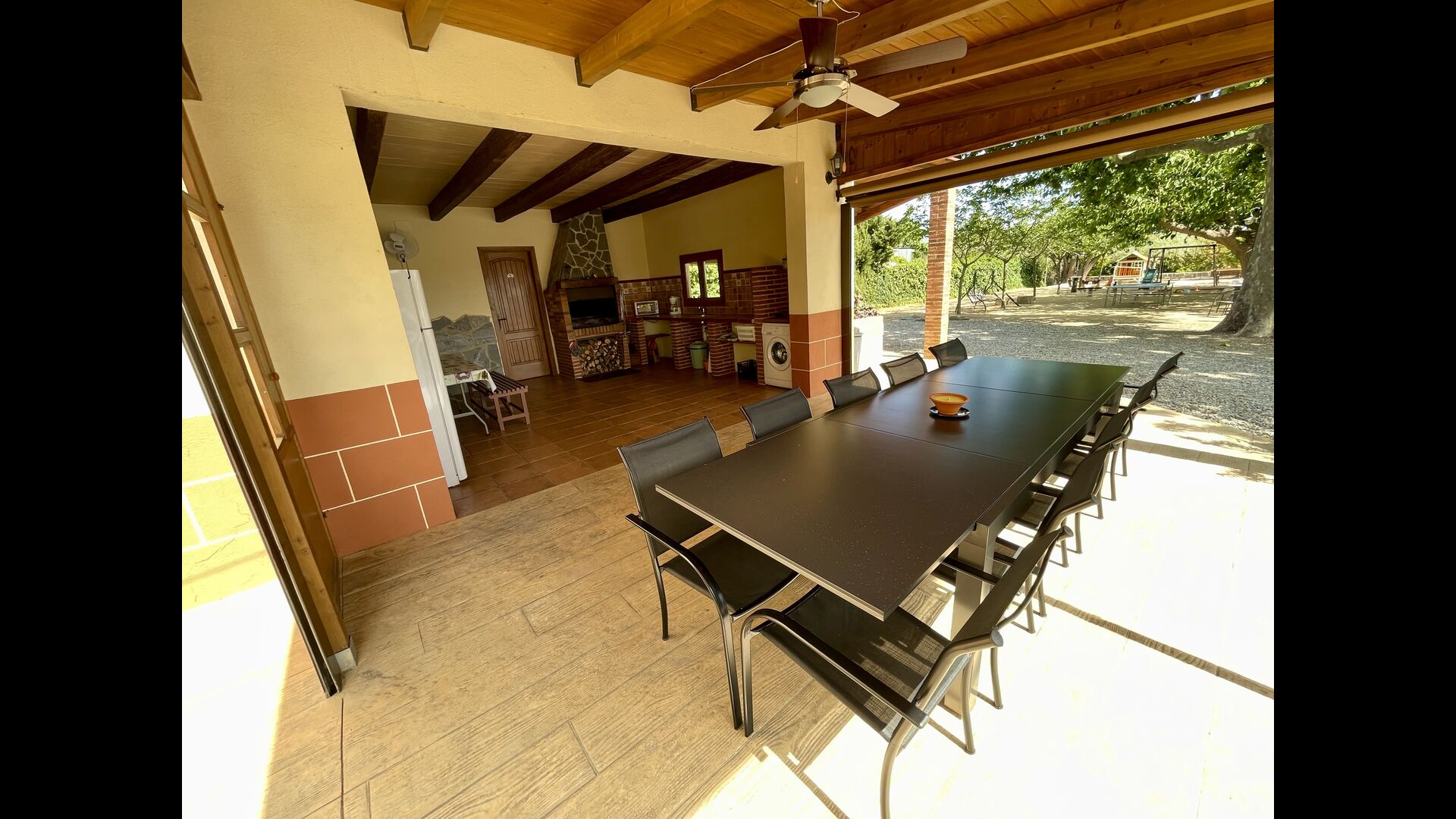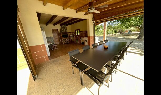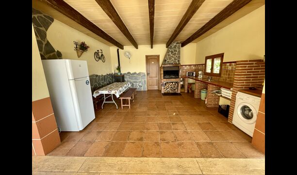 På den anden side er der to forskellige terrasser; en af dem er forbundet med det strålende udendørskøkken, der kommer med en lukket grillgrill, køleskab, mikroovn, en vask, og vaskemaskinen er også installeret her. Der er også et toilet, praktisk når du er i haven. Ligeledes i forbindelse er der et andet udendørs sofaområde med udsigt til legepladsen.