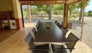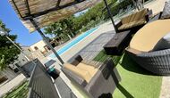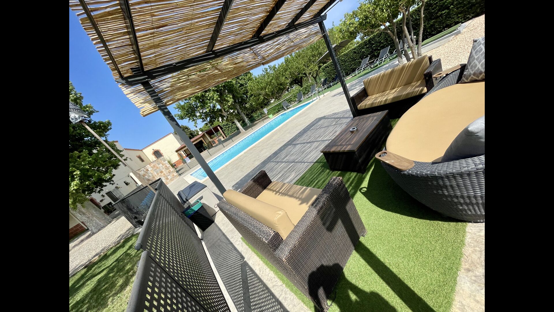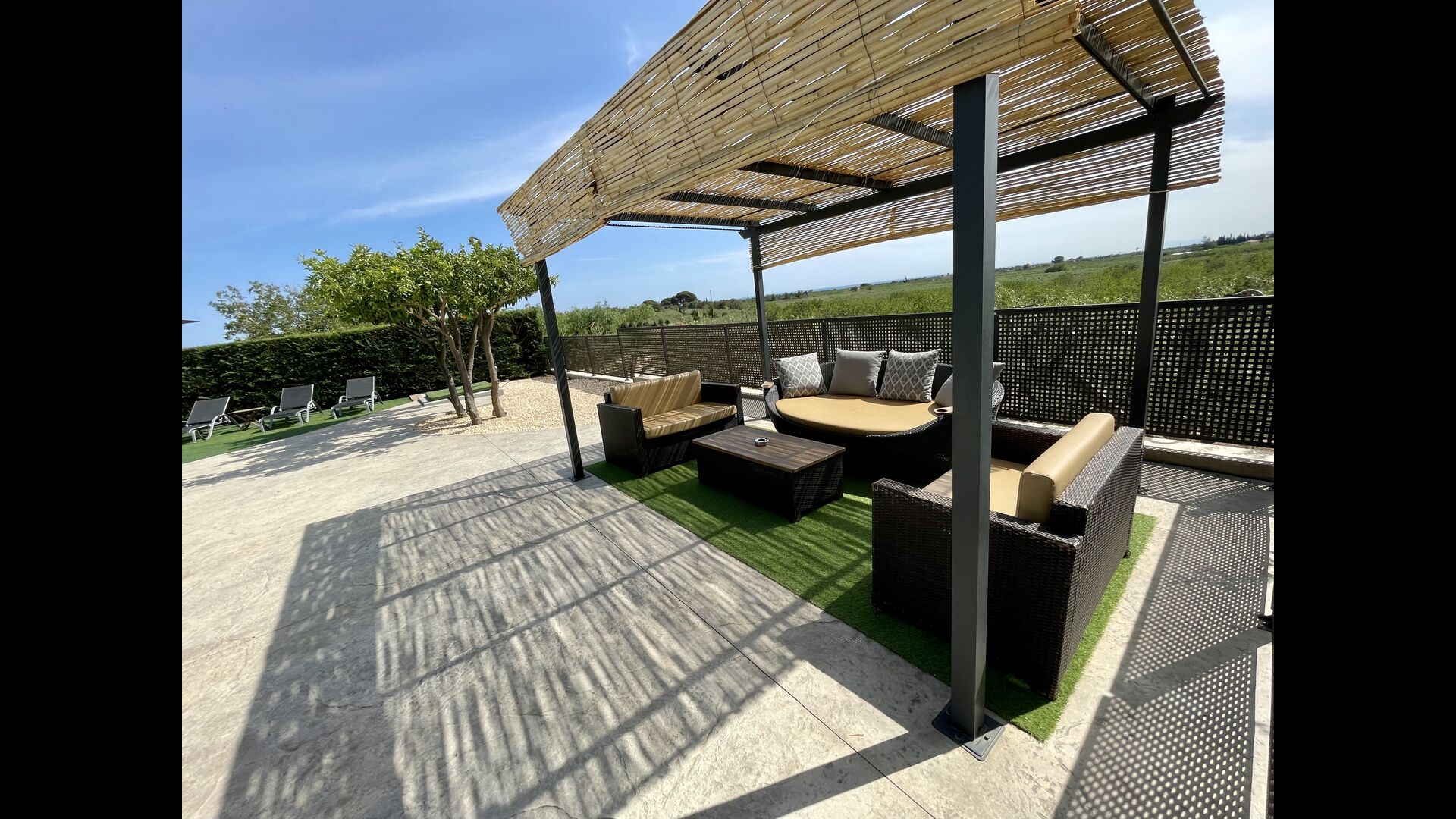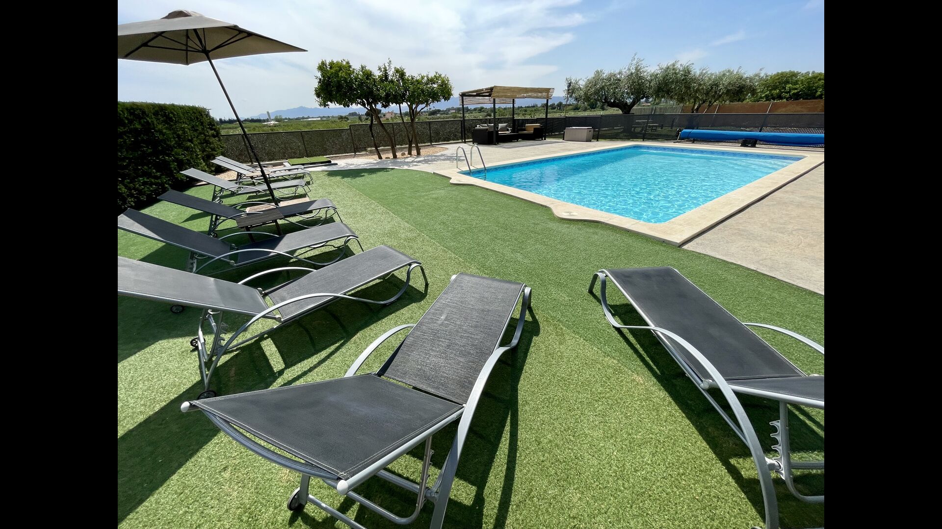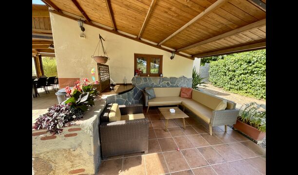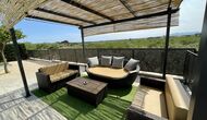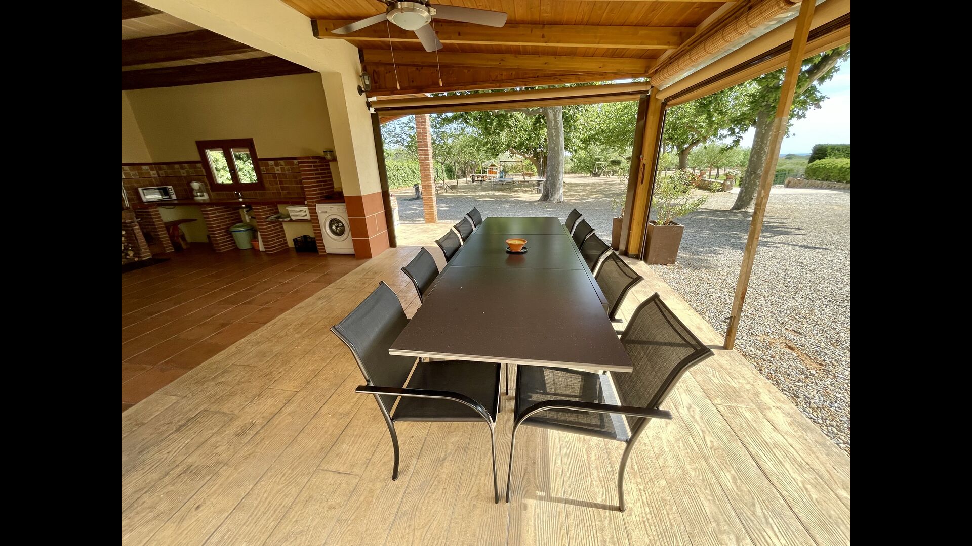 På den anden side er der to forskellige terrasser; en af dem er forbundet med det strålende udendørskøkken, der kommer med en lukket grillgrill, køleskab, mikroovn, en vask, og vaskemaskinen er også installeret her. Der er også et toilet, praktisk når du er i haven. Ligeledes i forbindelse er der et andet udendørs sofaområde med udsigt til legepladsen.