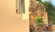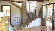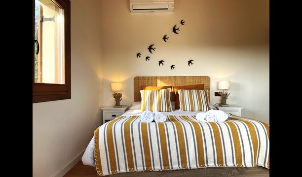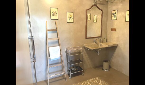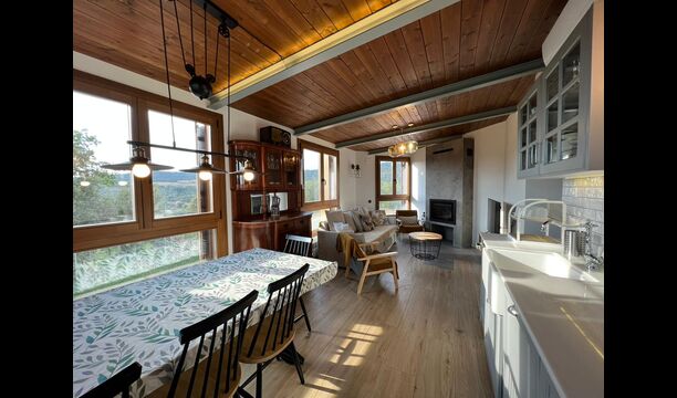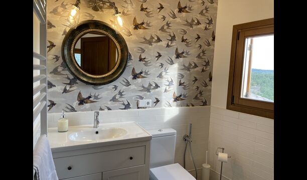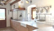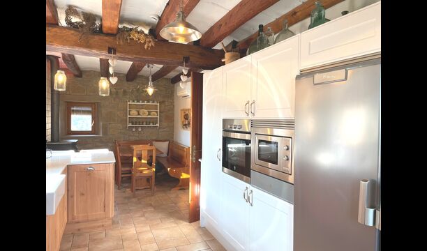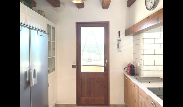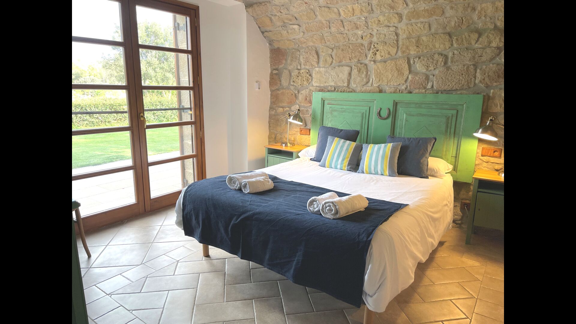 I grundplanet er der et dejligt dobbeltværelse med dobbeltseng, som har direkte udgang til haven og et lækkert badeværelse ensuite. Der er også toilet, en stue med minibutik, hvor man kan købe øl, kaffe og lækre lokale produkter. Når du går op ad trappen til 1. sal, kommer du ind i det meget moderne køkken med hvide corian bordplader, stort køleskab, fryser, ovn, mikroovn, elkedel – for at sige det kort: alt, hvad et køkken har brug for. Fra køkkenet er der endda udgang til en lille altan, hvor din morgenkaffe kan nydes med den fantastiske udsigt over den catalanske natur.