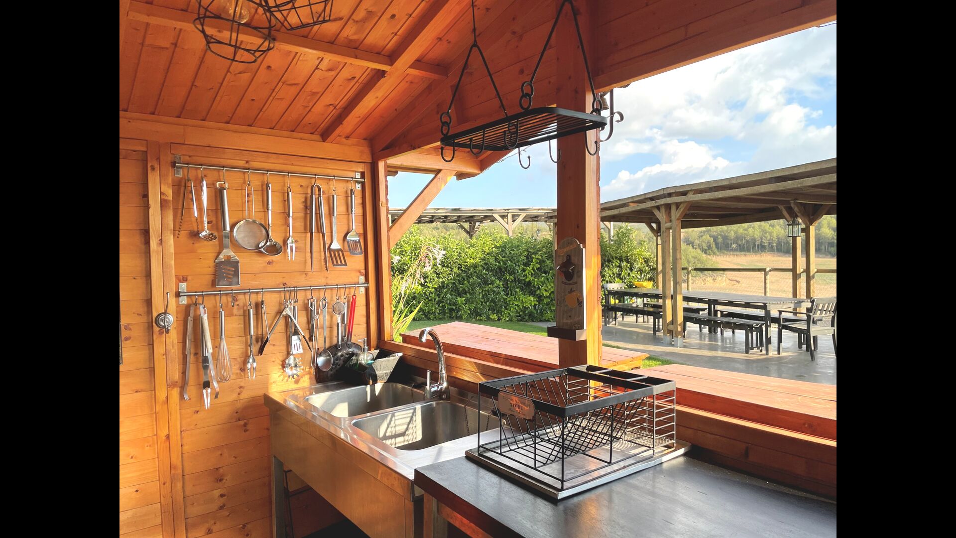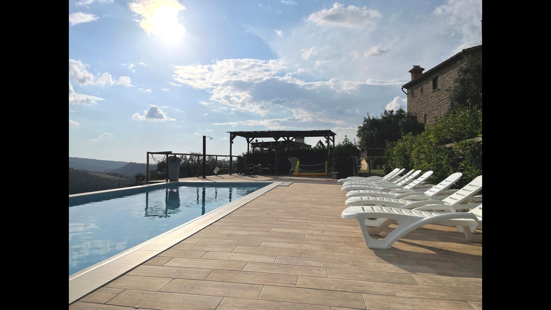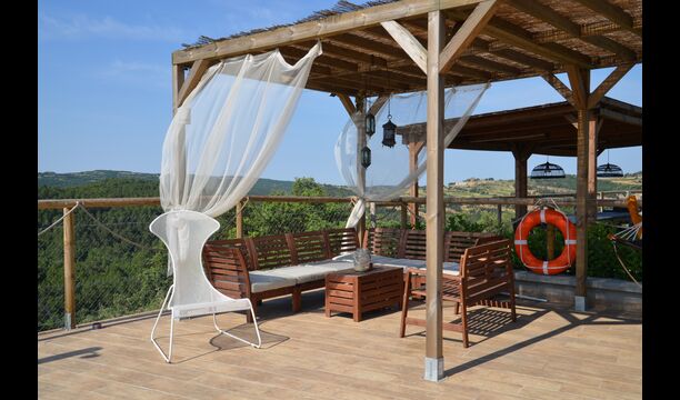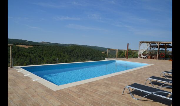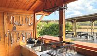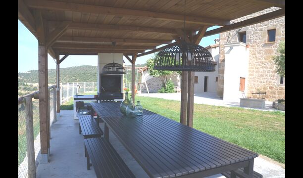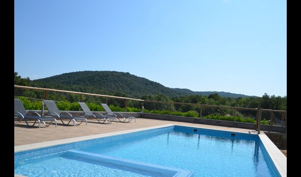 Det naturlige centrum for din ferie er det kombinerede terrasse- og poolområde, beliggende for at nyde den fantastiske udsigt. Her finder du den indhegnede pool med romerske trapper, lav børneafdeling og det unikke, store, overdækkede chill-out område. Det overdækkede chill-out område indeholder både et langt spisebord og et moderne udekøkken.