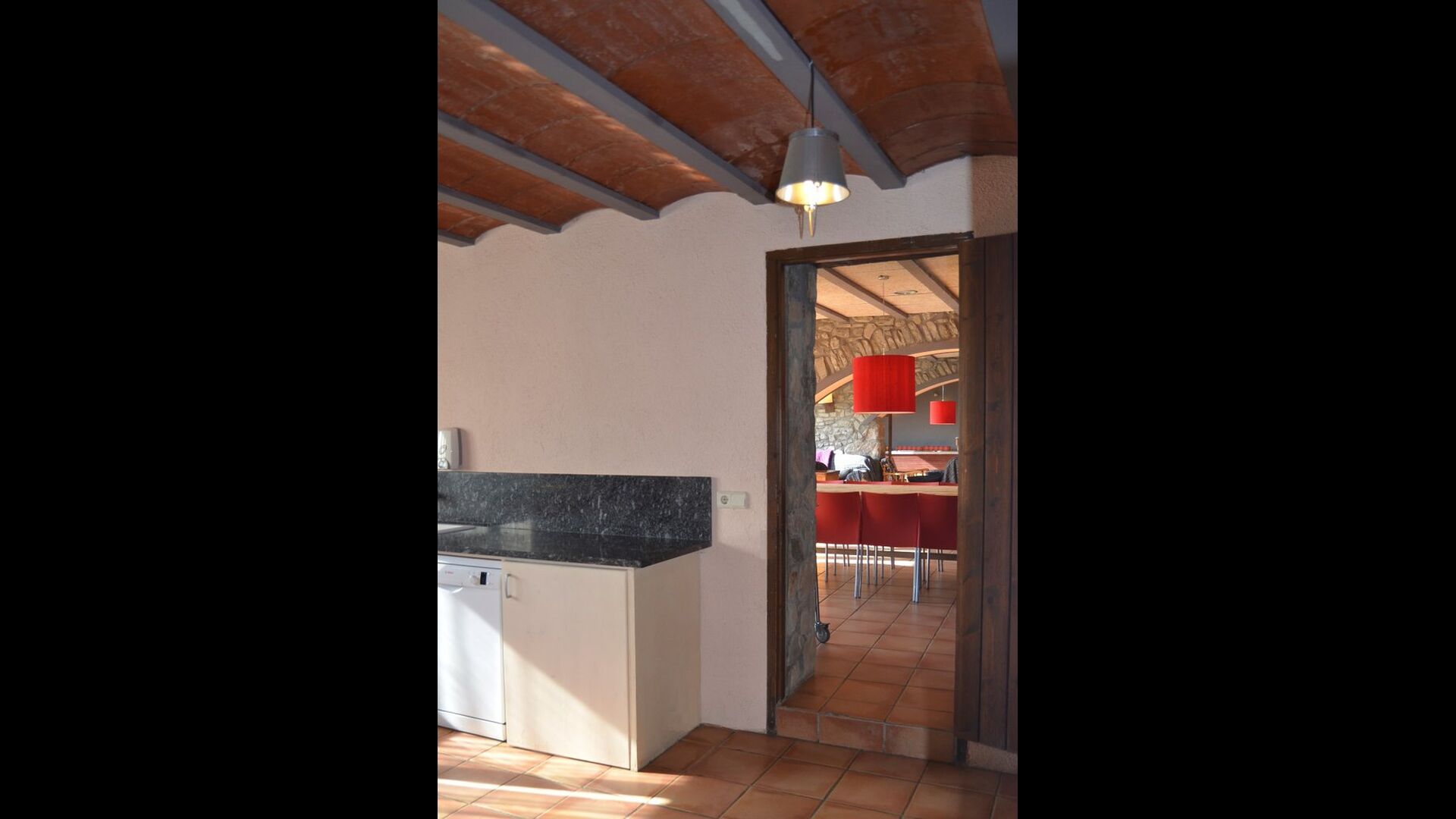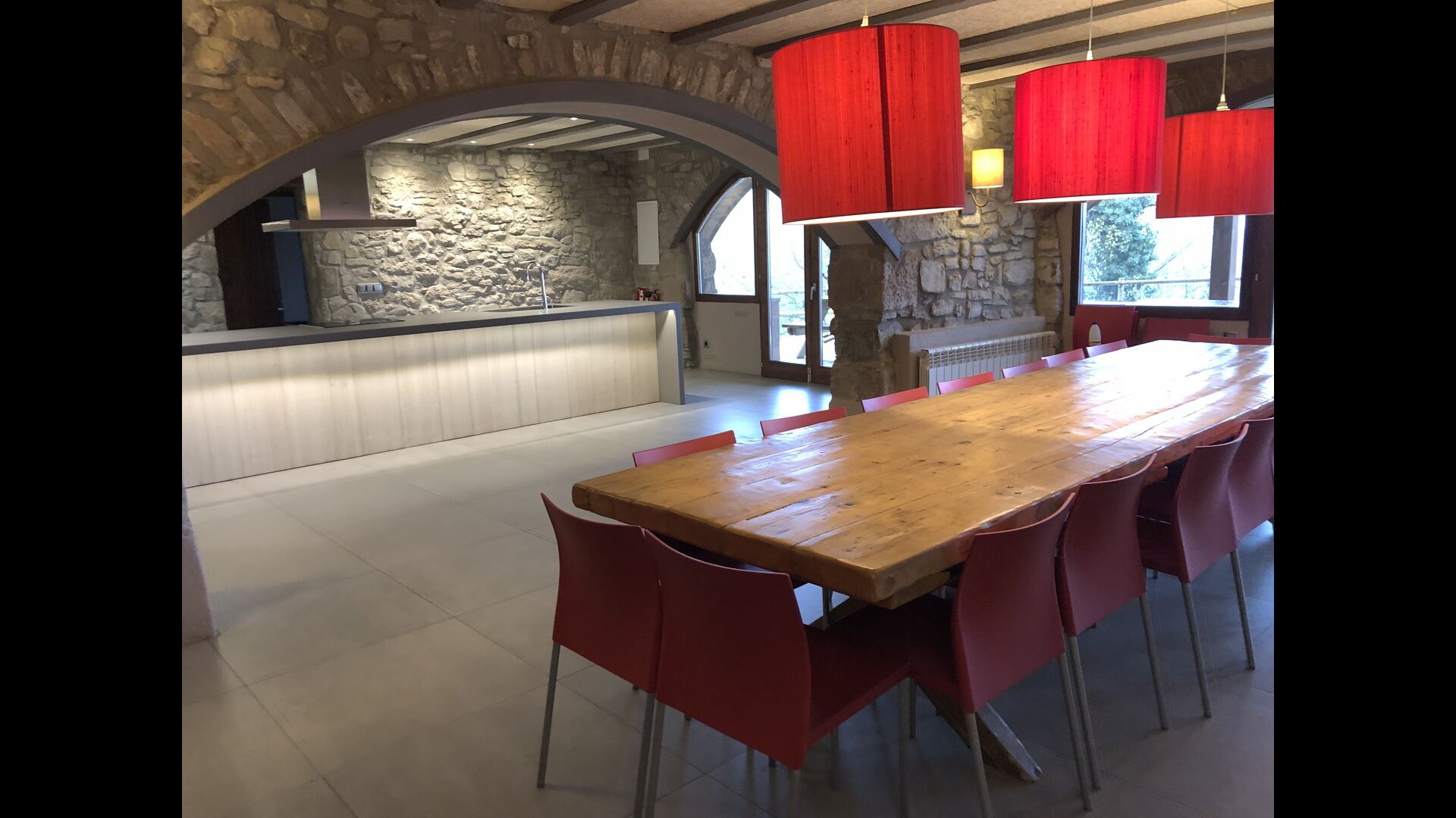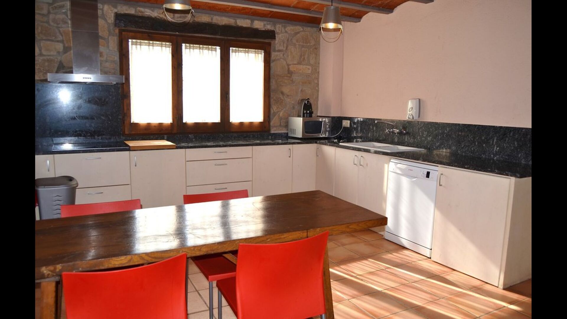 I husets stueetage er der 3 dobbeltdøre, som kan åbnes ud til haven. Man kan på den måde forbinde det med stuen, og derved med spiseområdet, der har et stort, smukt og meget langt træbord. Lige ved siden af er det store, veludstyrede og funktionelle køkken, der bl.a. har opvaskemaskine, keramiske kogeplader, ovn, mikroovn, to køleskabe, fryser, Nespresso-maskine, brødrister, og en elektrisk paella-pande. På stueetagen er der også et toilet med bruser, nyttig, når du er i haven.