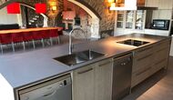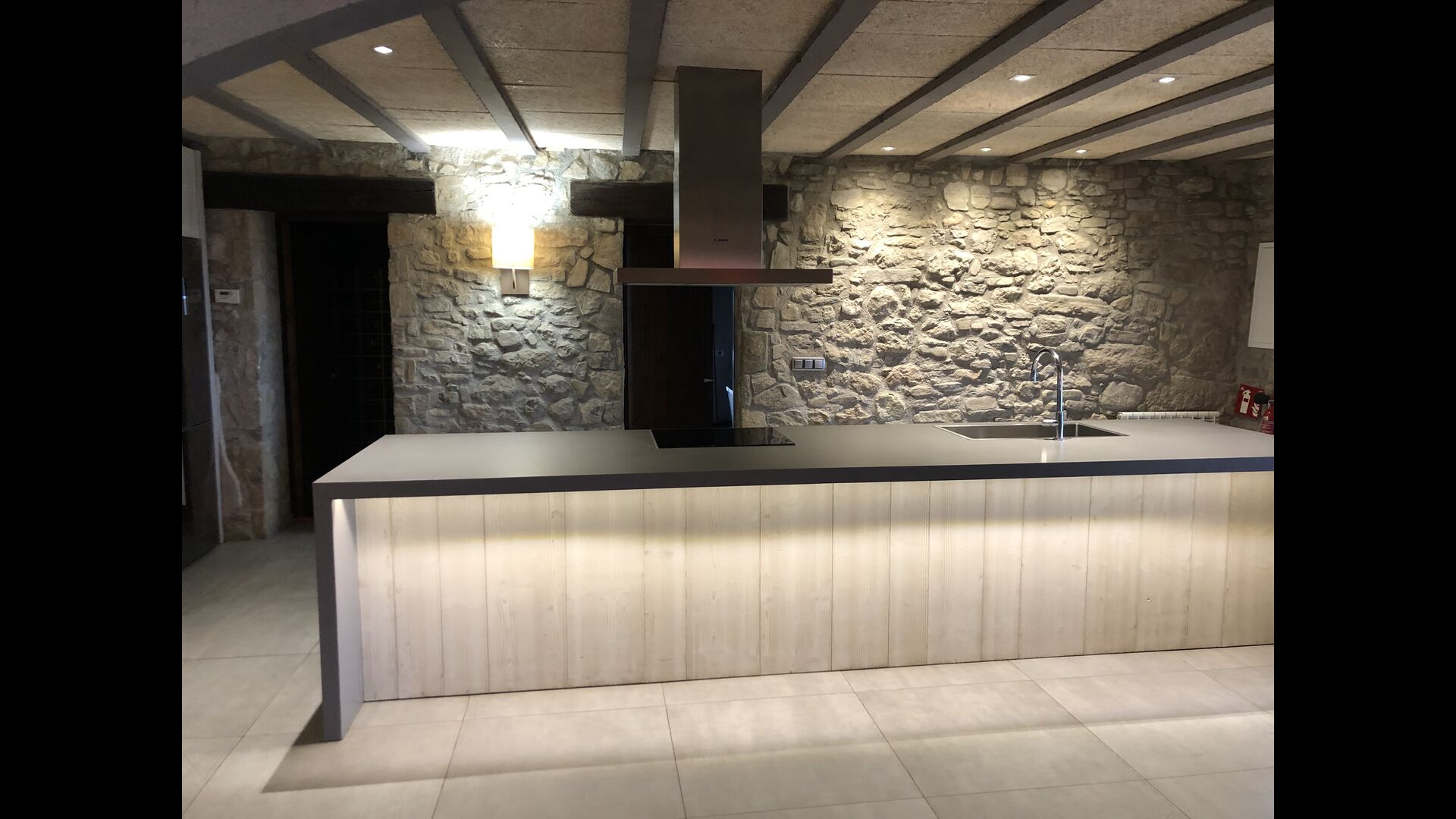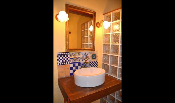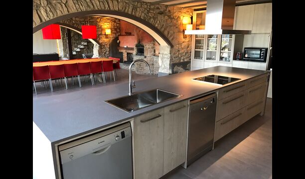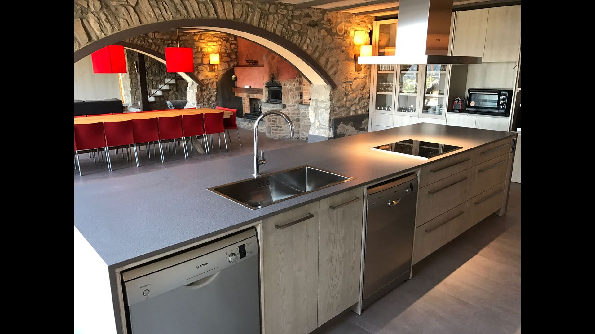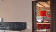 I husets stueetage er der 3 dobbeltdøre, som kan åbnes ud til haven. Man kan på den måde forbinde det med stuen, og derved med spiseområdet, der har et stort, smukt og meget langt træbord. Lige ved siden af er det store, veludstyrede og funktionelle køkken, der bl.a. har opvaskemaskine, keramiske kogeplader, ovn, mikroovn, to køleskabe, fryser, Nespresso-maskine, brødrister, og en elektrisk paella-pande. På stueetagen er der også et toilet med bruser, nyttig, når du er i haven.