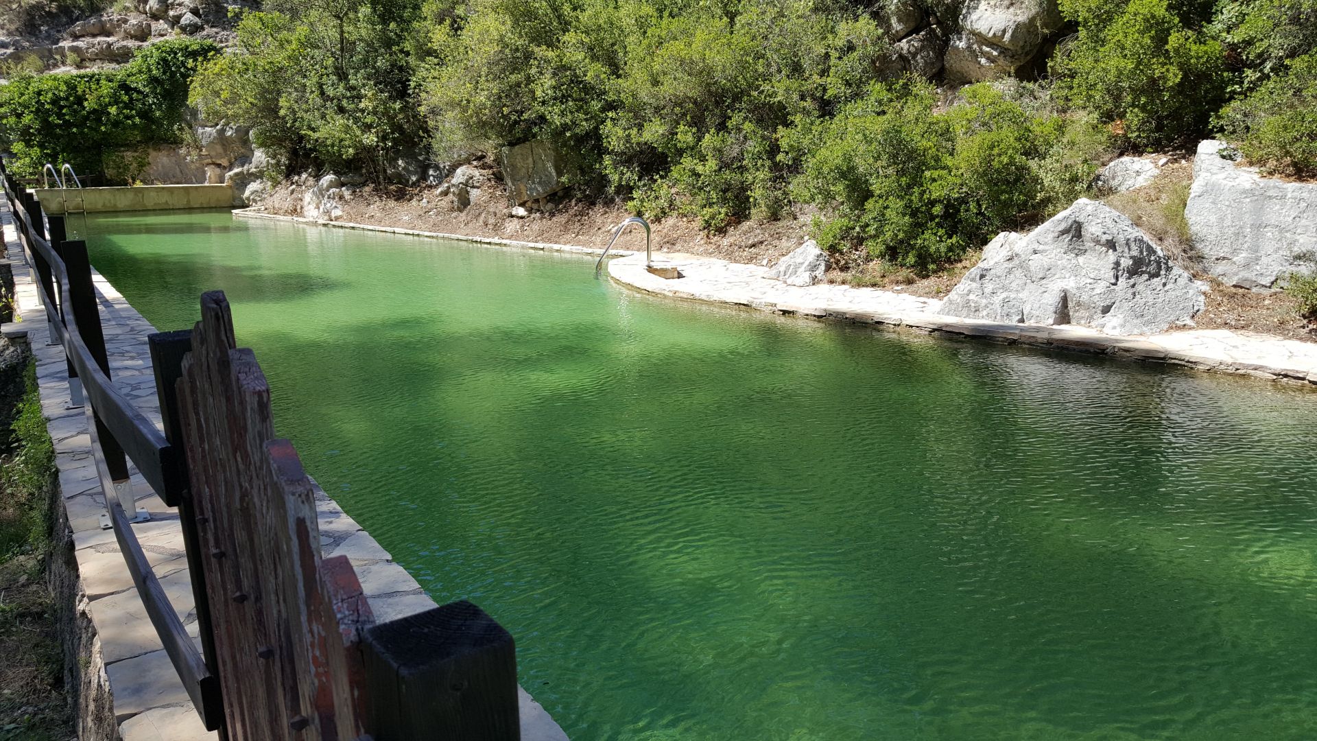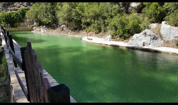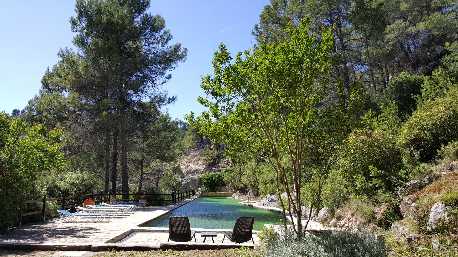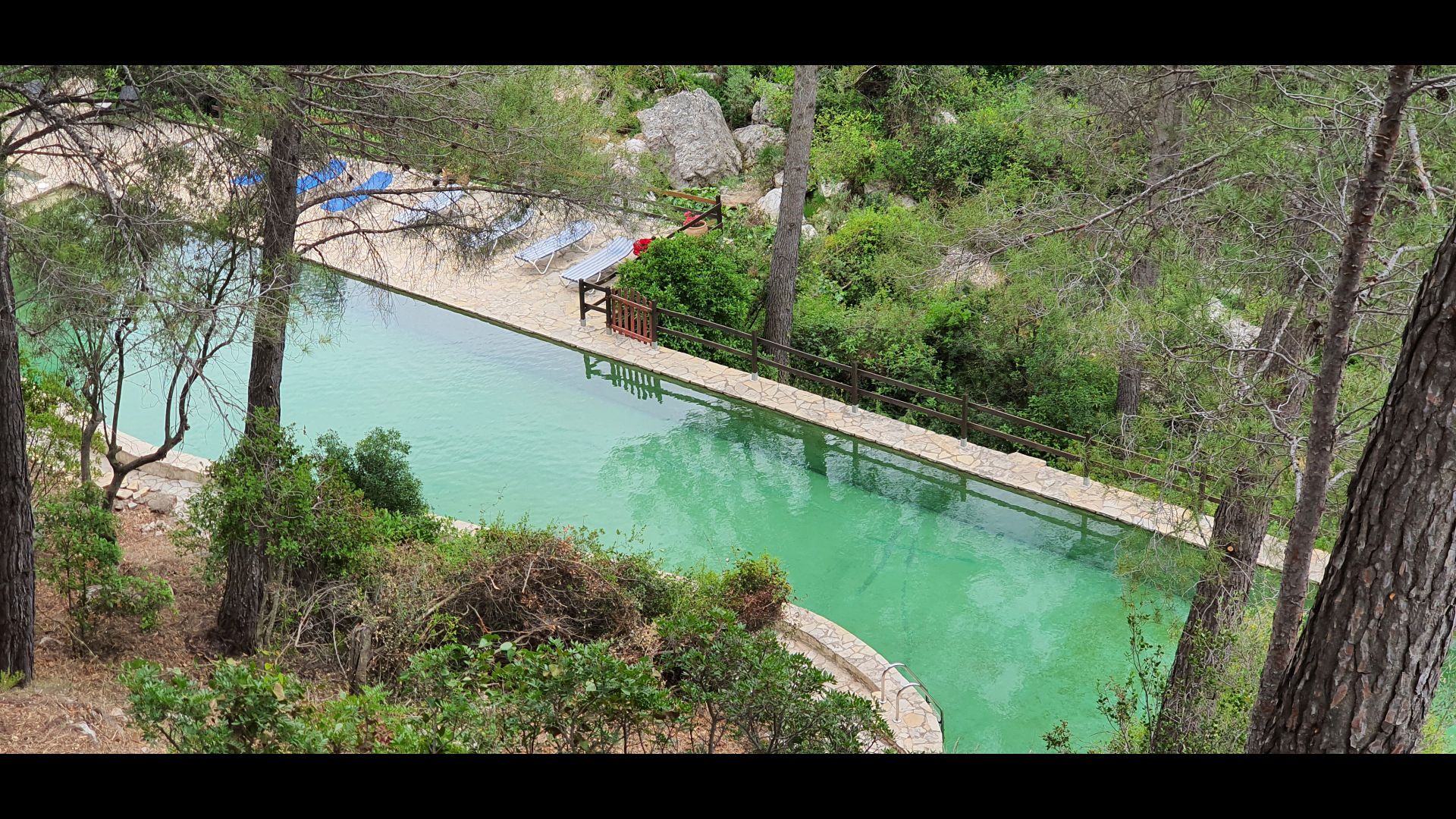 Atmosfæren udendørs er svær at beskrive med ord, da beliggenheden er meget unik. Vandfaldet giver en friskhed og træerne og kløftens bjergsider giver mange skyggefulde hjørner. Man føler sig næsten i et med naturen her. Kanalsystemet som oprindeligt er lavet for at give energi til vandmøllen, er intelligent blevet videreført til swimmingpoolen, og det helt rene vand, som kommer fra en kilde, der udspringer få kilometer fra huset, bliver ledt igennem den 45 meter lange swimmingpool og derefter videre ud i floden. Det er også muligt at svømme under og ved siden af vandfaldet og flere andre steder i floden i nærheden.