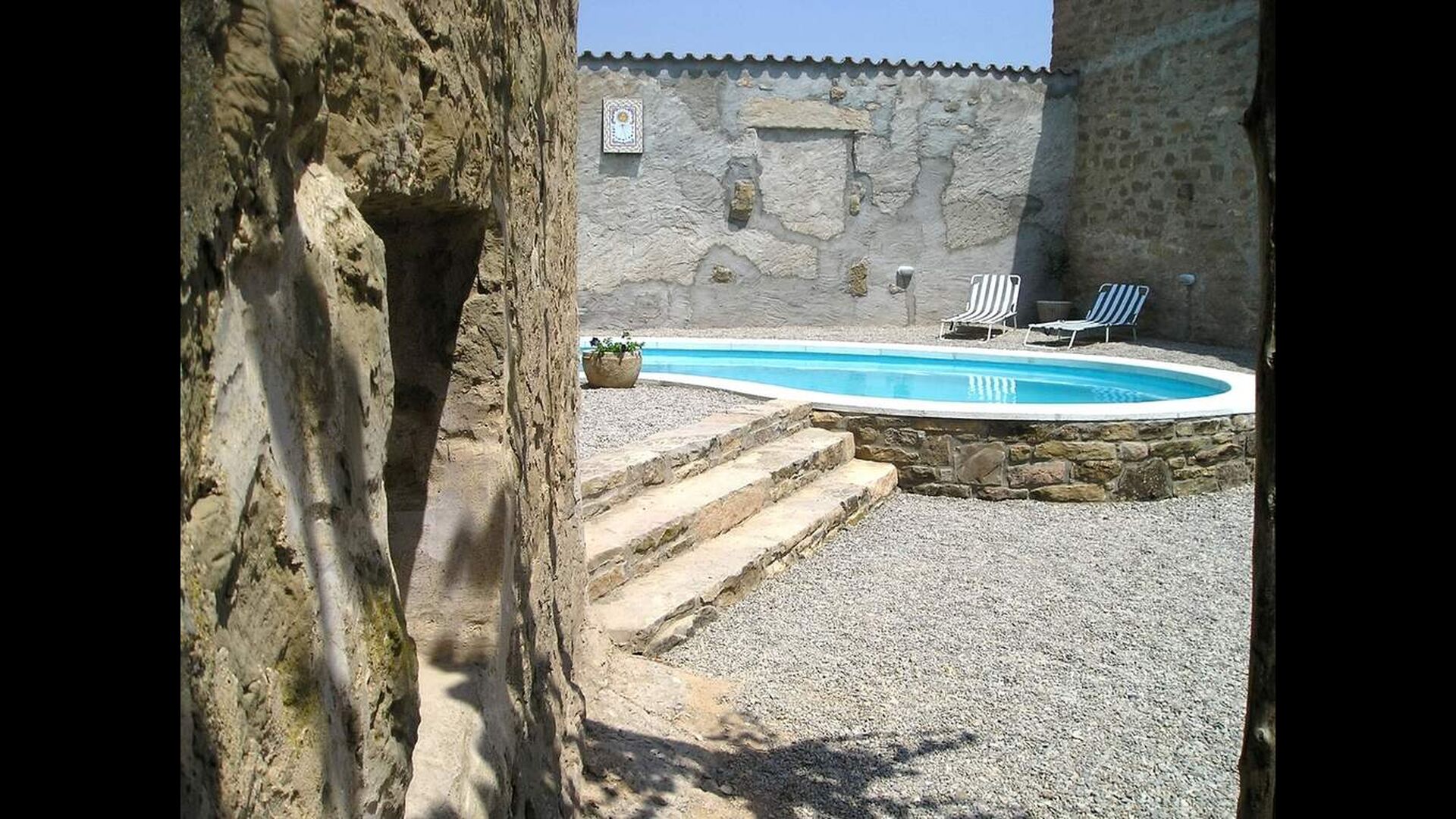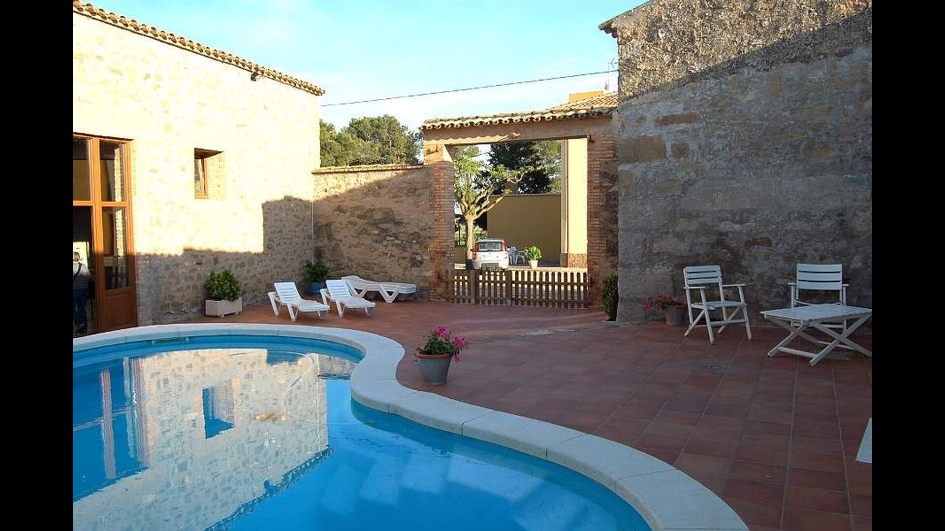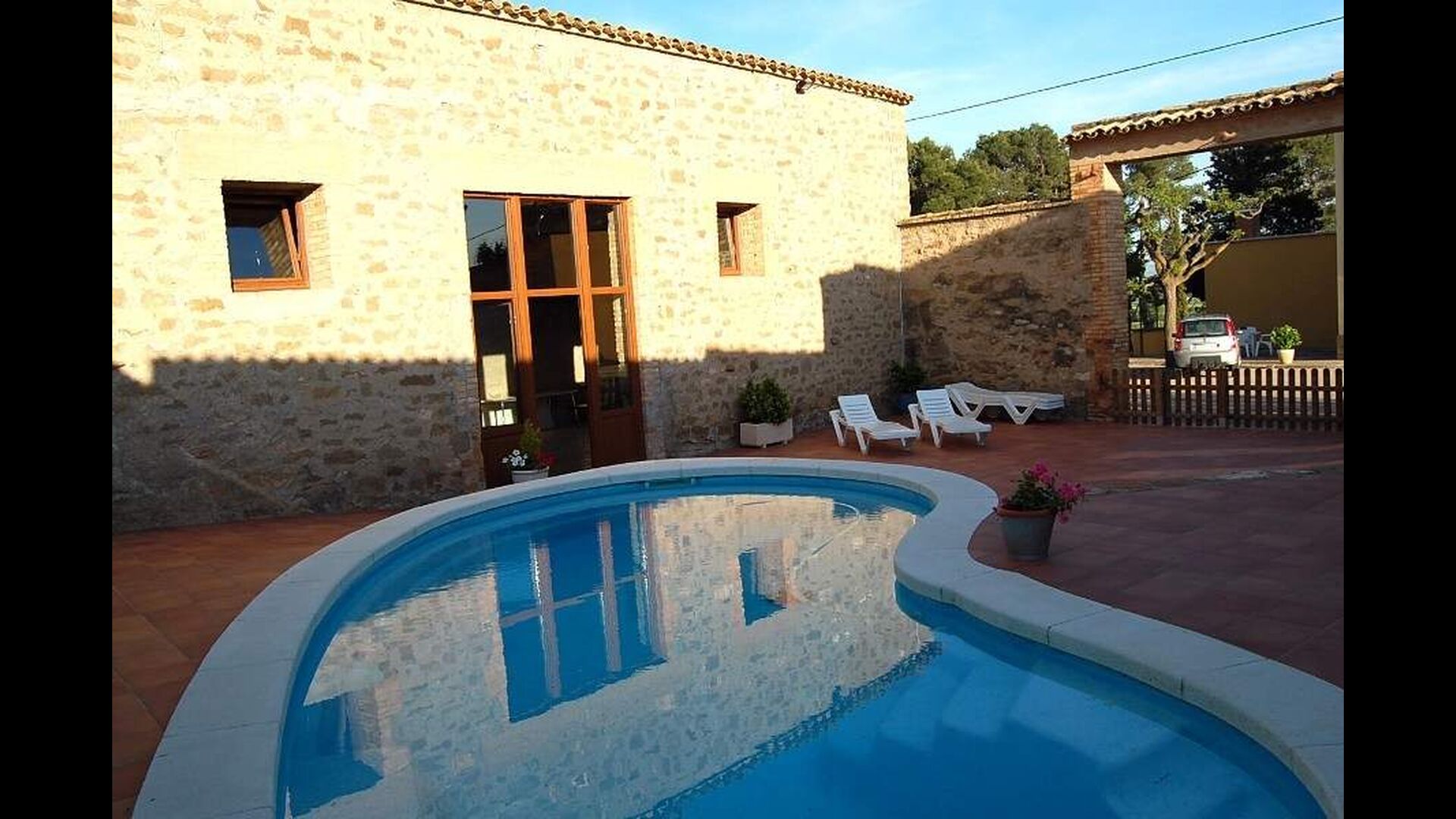 The pool-area is situated between the two buildings. It has a beautiful swimming pool with sunbeds and the pool-area can be closed by a gate if you bring small children. There area has a covered terrace which also can be used for celebrations. Furthermore, the pool-area has two toilets.