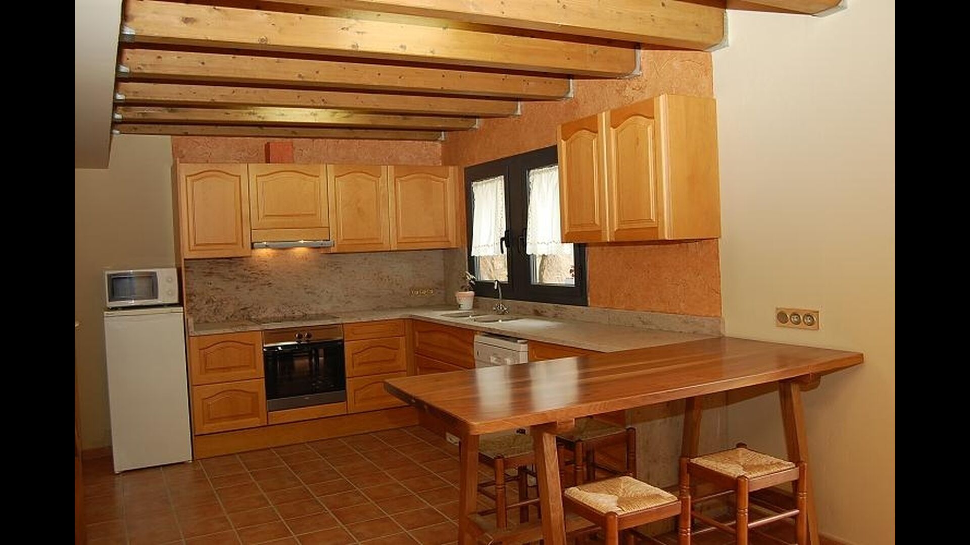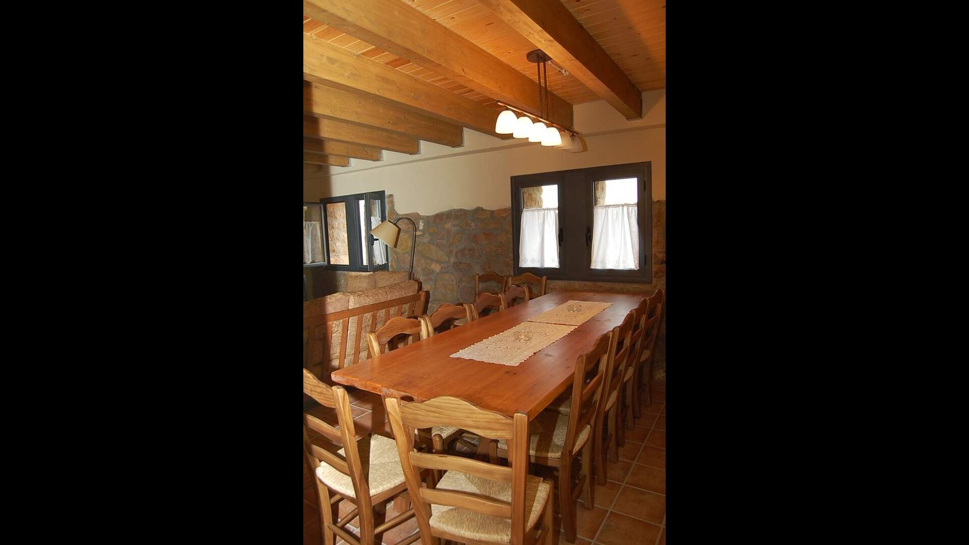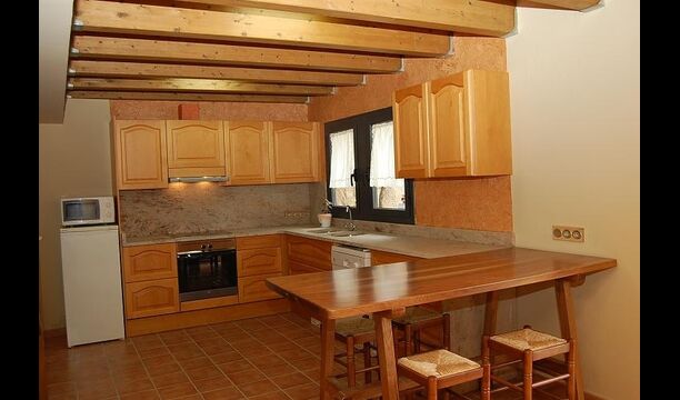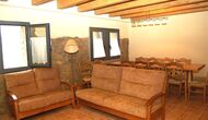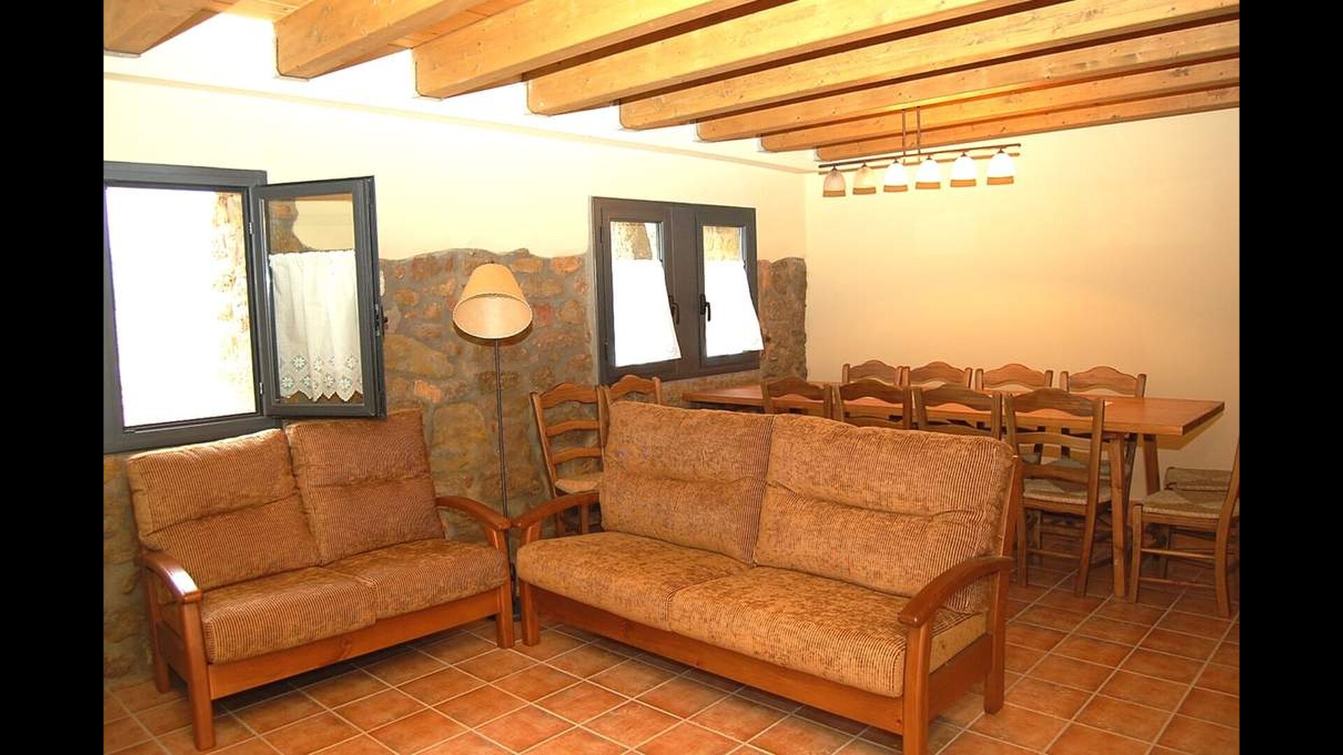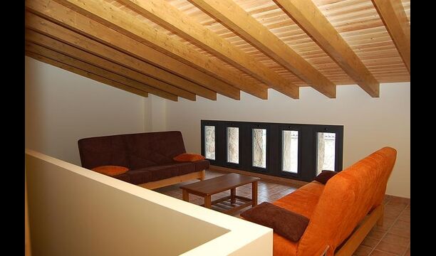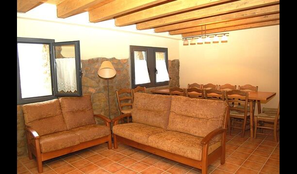 Huset har tre etager med en hyggelig indretningen. Stilen er traditionel katalansk bl.a. med kalkstensvægge og træbjælker i loftet. Det skaber en afslappet atmosfære og plads til at hygge sig. Fællesrummene findes på underetagen i huset, herunder et meget veludstyret køkken, spisestue med et stort bord og et et sofahjørne med komfortable sofaer og et tv.