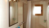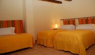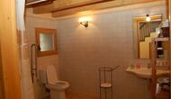Herfra kan man enten gå igennem det der tidligere var stalden og nu brugest til parkering af mountain bikene, ud til gården, hvor man kan parkere, eller man gå op på første sal, hvor der er fem rummelige værelser, heaf to med dobbeltsenge og tre fuldt udstyrede badeværelser alle med brus.