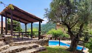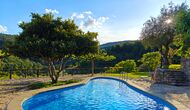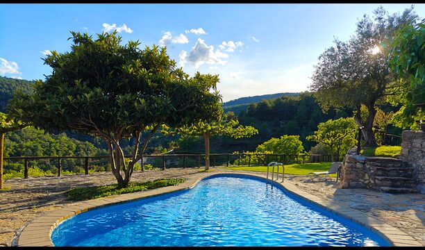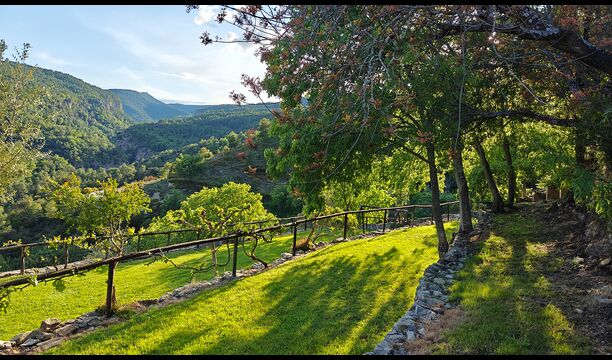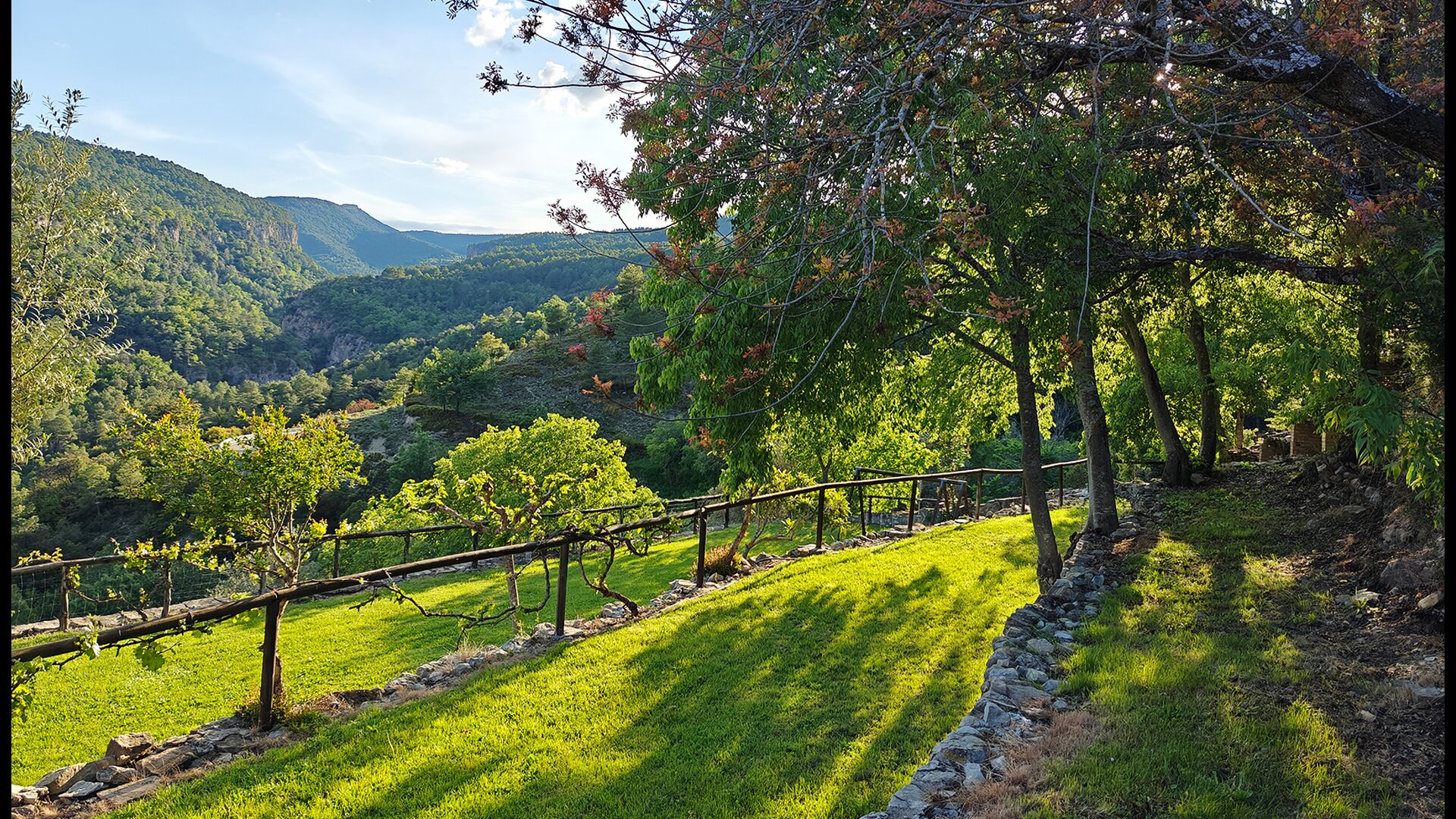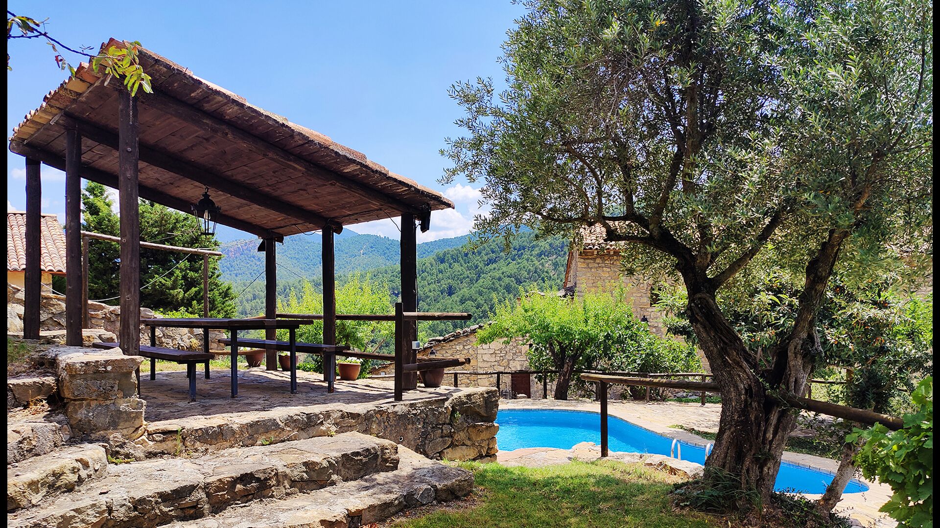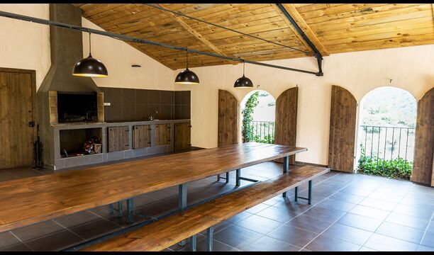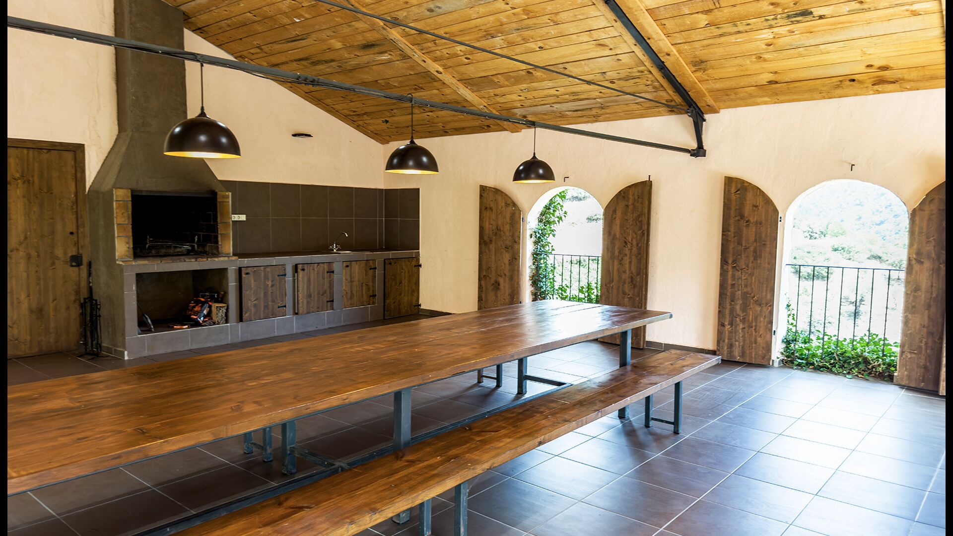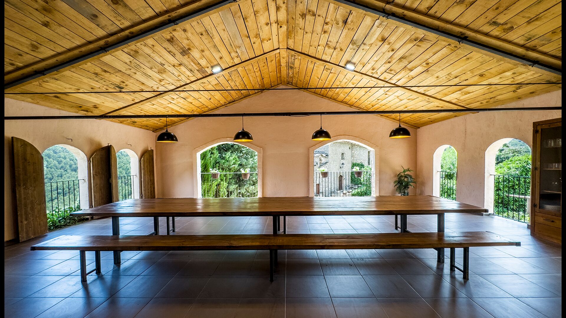 Den overdækkede terrasse er et af de mest charmerende steder i huset og perfekt til morgenmad eller afslapning, mens man lytter til den nærliggende Valldarques-bæk.