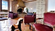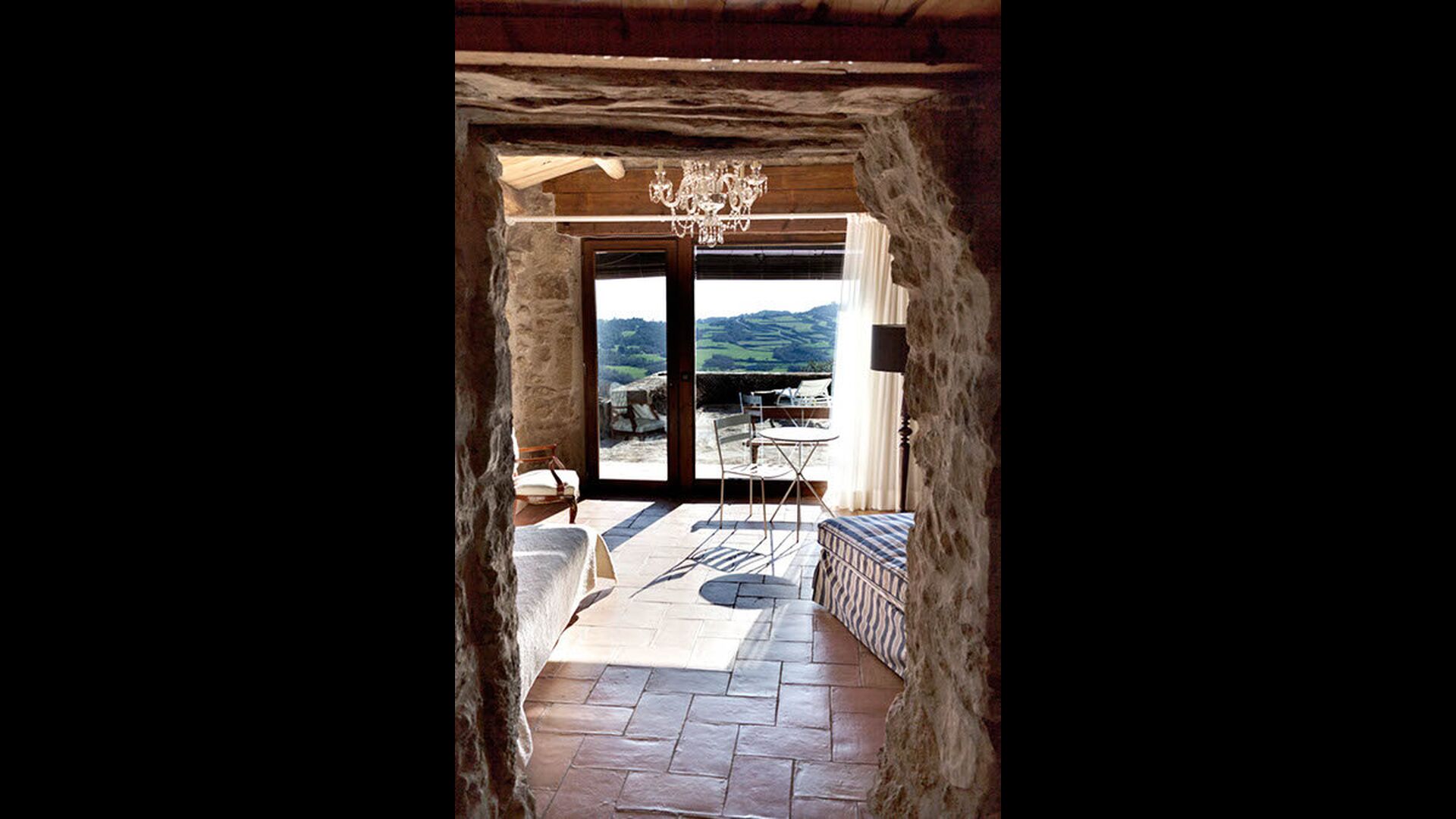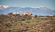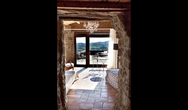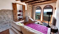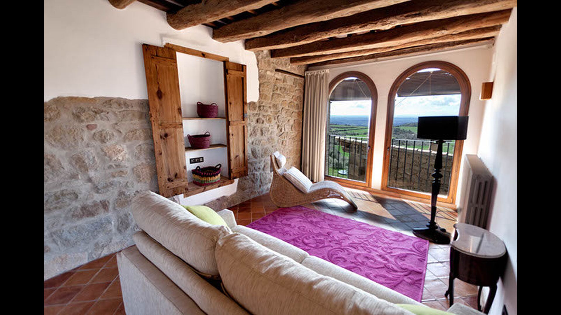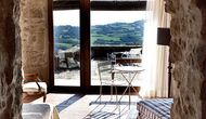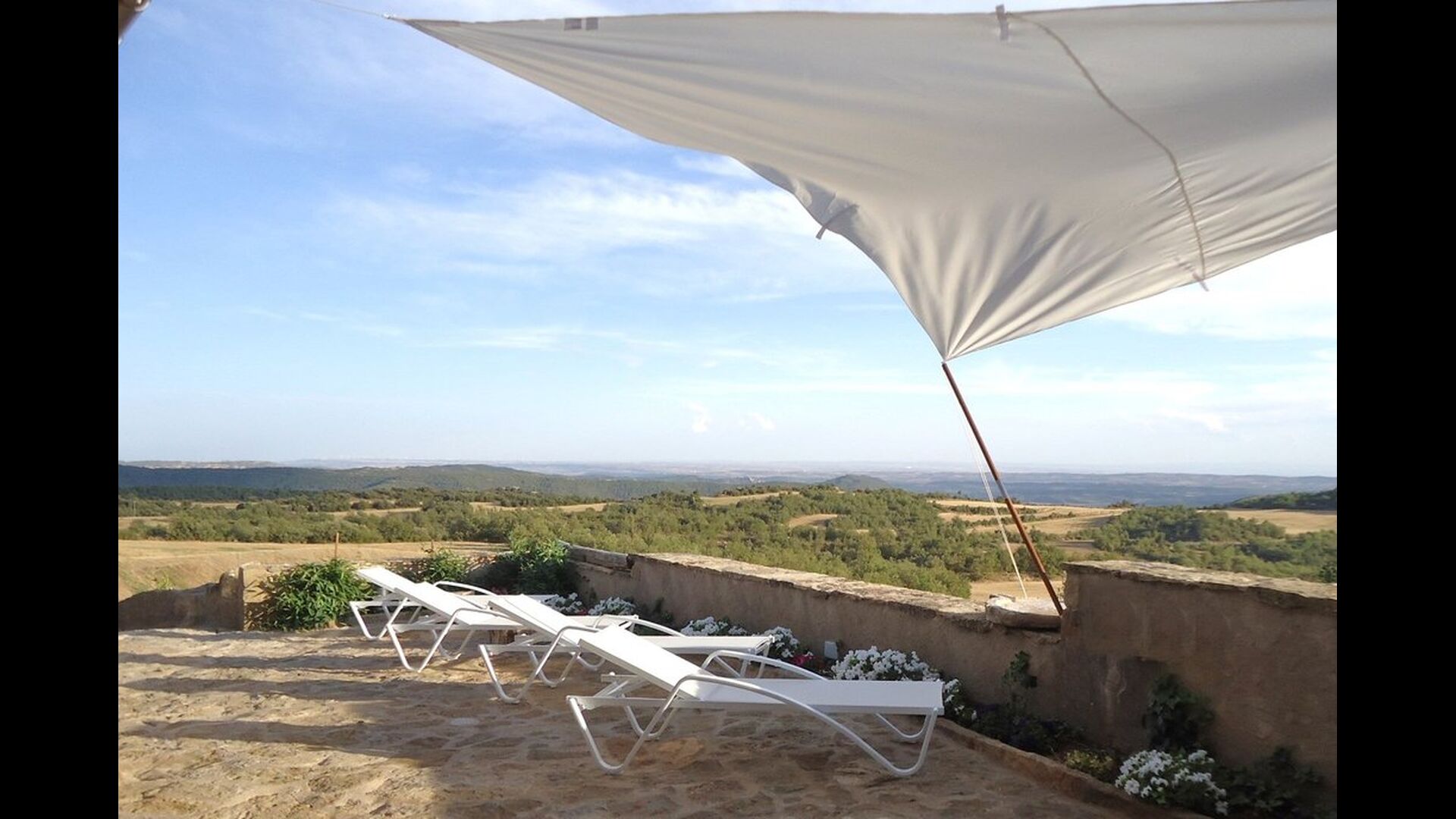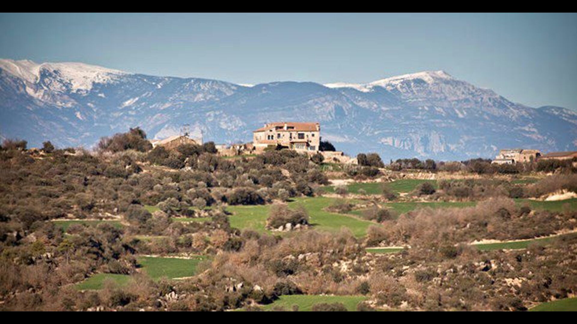 Feriehuset er placeret på toppen af en mindre bakke, hvilket giver en betagende udsigt over det bølgende landskab, der domineres af marker og træer. I baggrunden af huset rejser Pyrenæerne sig med sine sneklædte toppe.