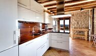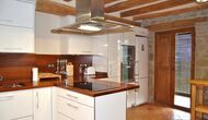 Køkkenet er ligesom resten af huset af høj kvalitet, og der er bl.a. mikroovn, opvaskemaskine og ovn. I rummet ved siden af er et langt spisebord med plads til alle. I forlængelse af dette spiseområde er der et hyggeligt sofaområde med pejs og god udsigt udover landskabet.