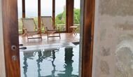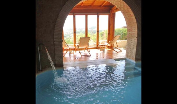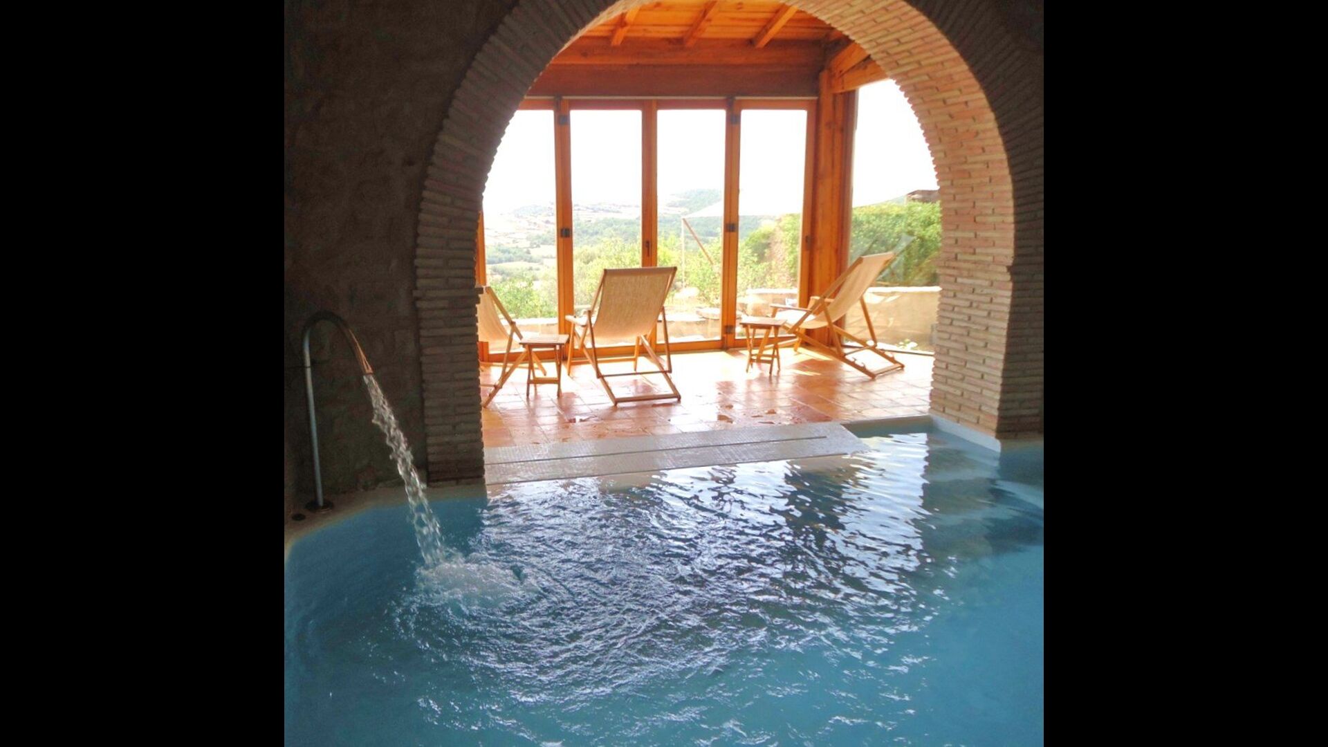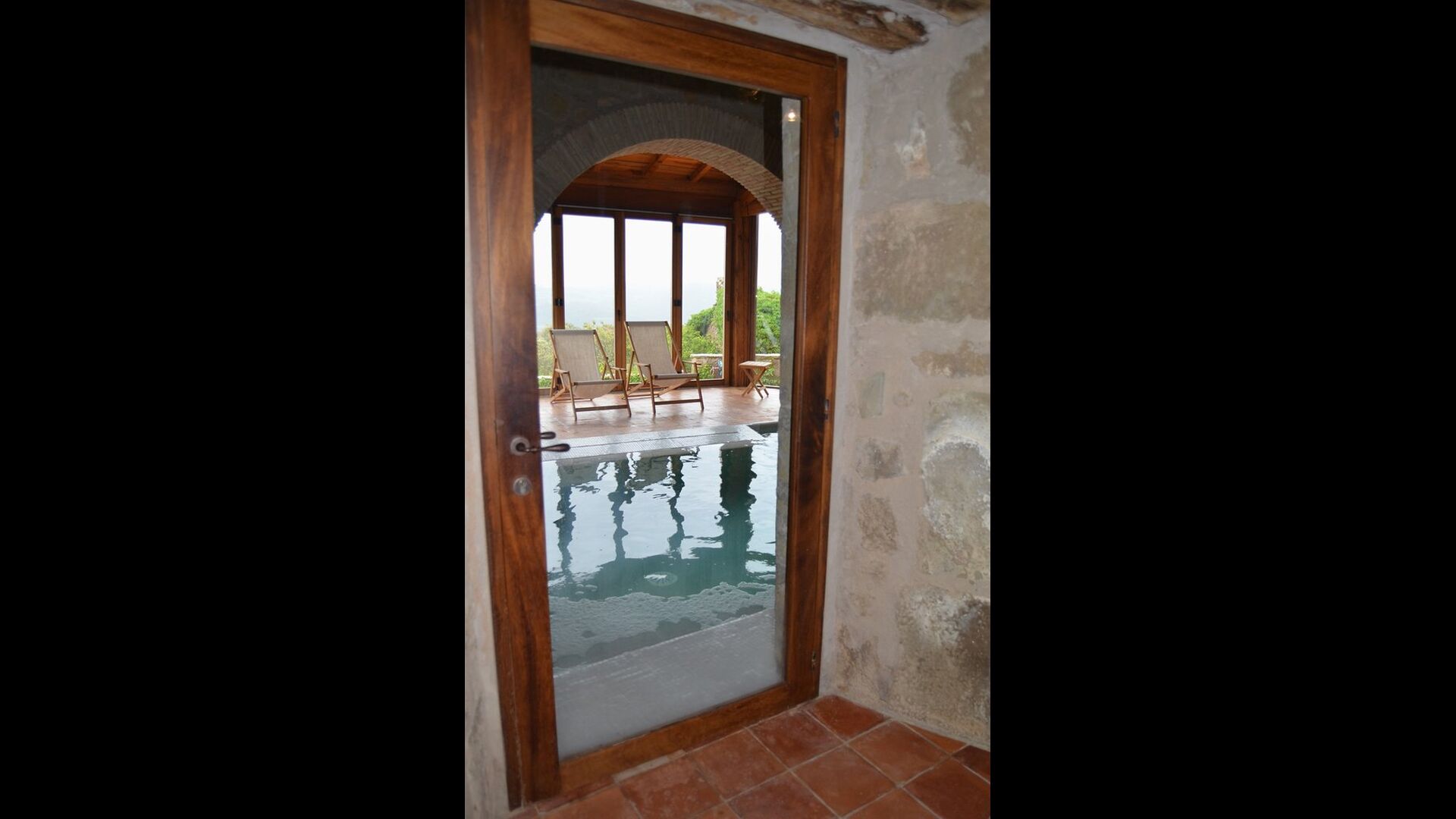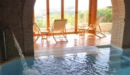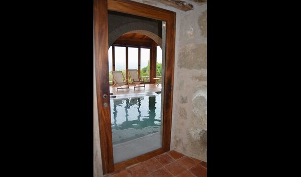 Den indendørs pool med opvarmet vand bidrager til feriehusets luksuriøse stil. Fra selve poolen kan man gennem store vinduer nyde udsigten.
