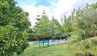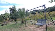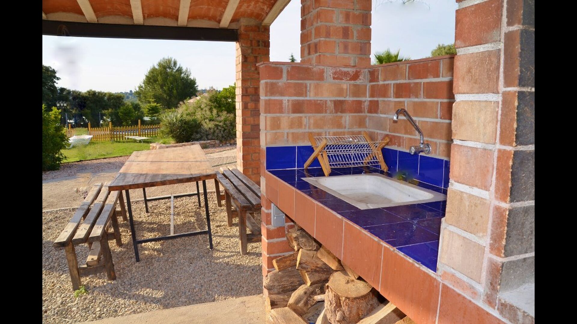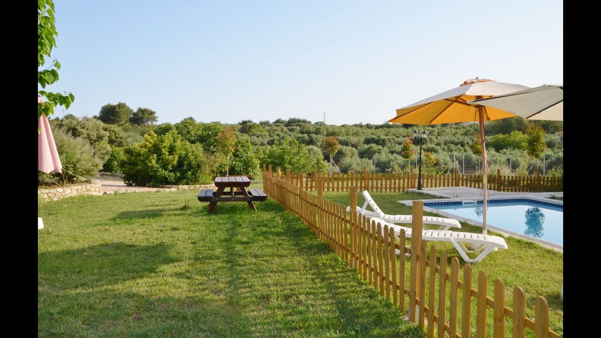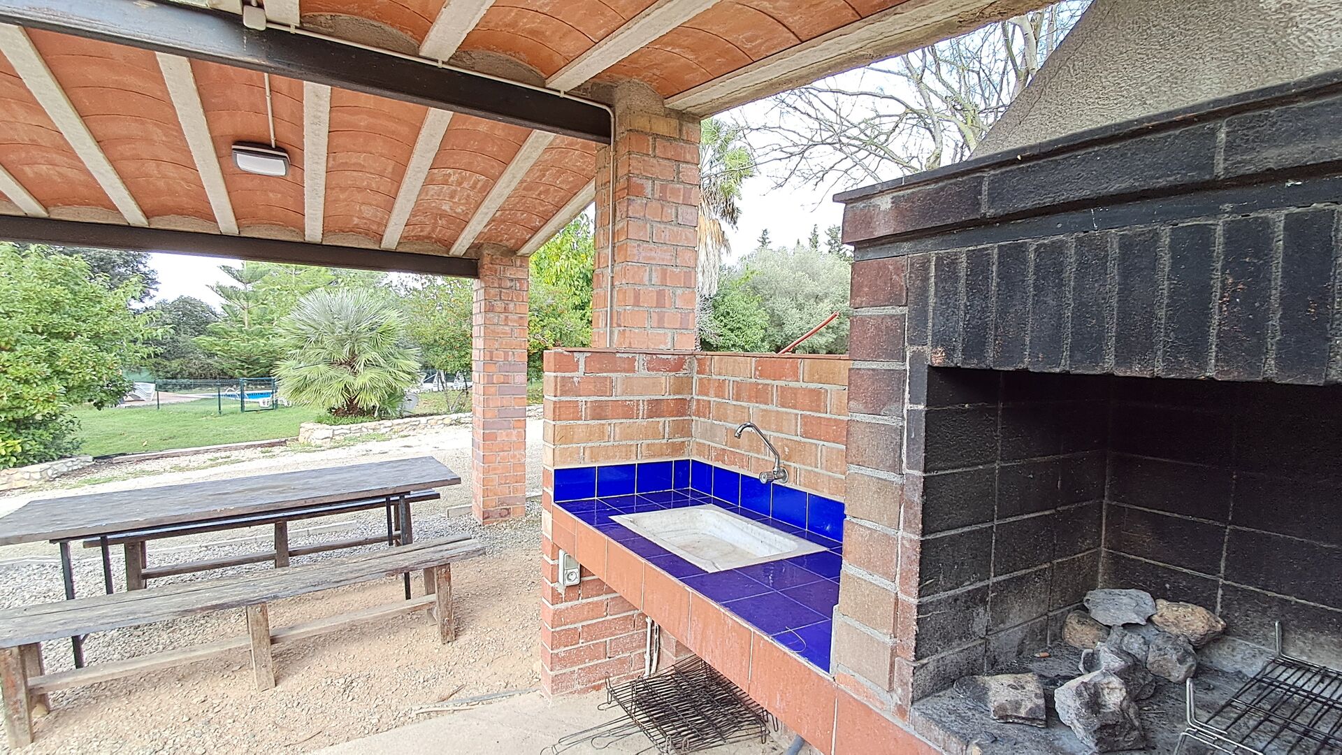 Haven har hvad du har brug for til en afslappende ferie: Overdækket grillplads med vand og siddepladser, swimmingpool og gynger til børnene og en smuk udsigt.