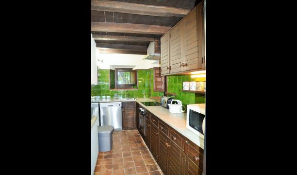 Huset er nyligt gennemrenoveret og har nu atmosfære, hvor du straks føler dig godt tilpas og hjemme. Fra stueetagen er der en udgang til poolområdet og terrassen, hvor der er plads til udendørs spisning og parasoller foran plænen. For de mindste er der en sandkasse.